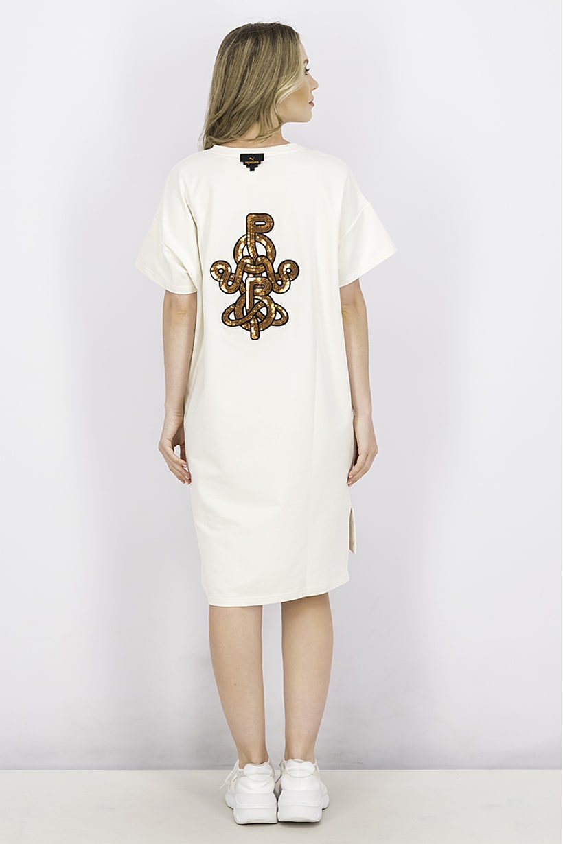 This sportswear dress features a slit hem at the bottom and is designed with a sportswear fit. It is made of a light fabric blend of 67% cotton, 26% polyester, and 7% elastane, and is machine washable for easy care. The dress has an embroidered pattern and print, and is a pullover style with off-white color. Please note that the product color may vary slightly due to photographic lighting sources or monitor settings. Ideal for training, this dress is a great addition to your sportswear collection.