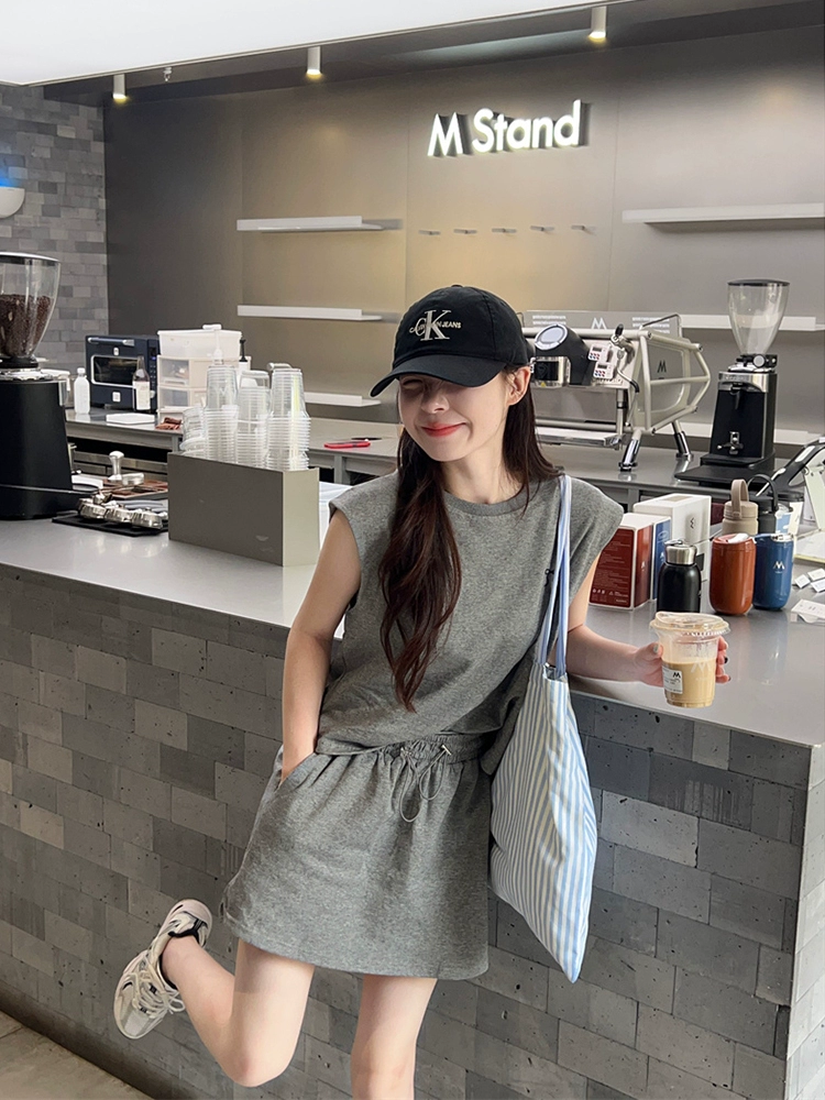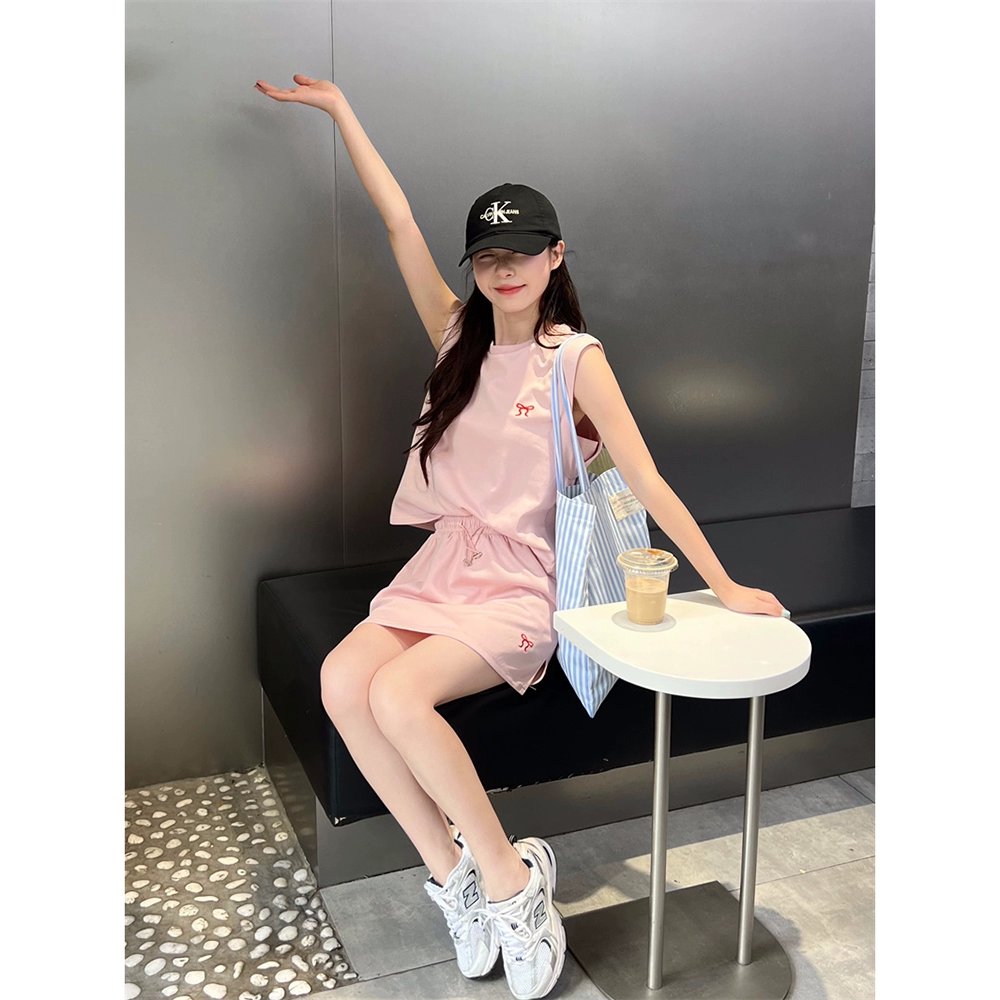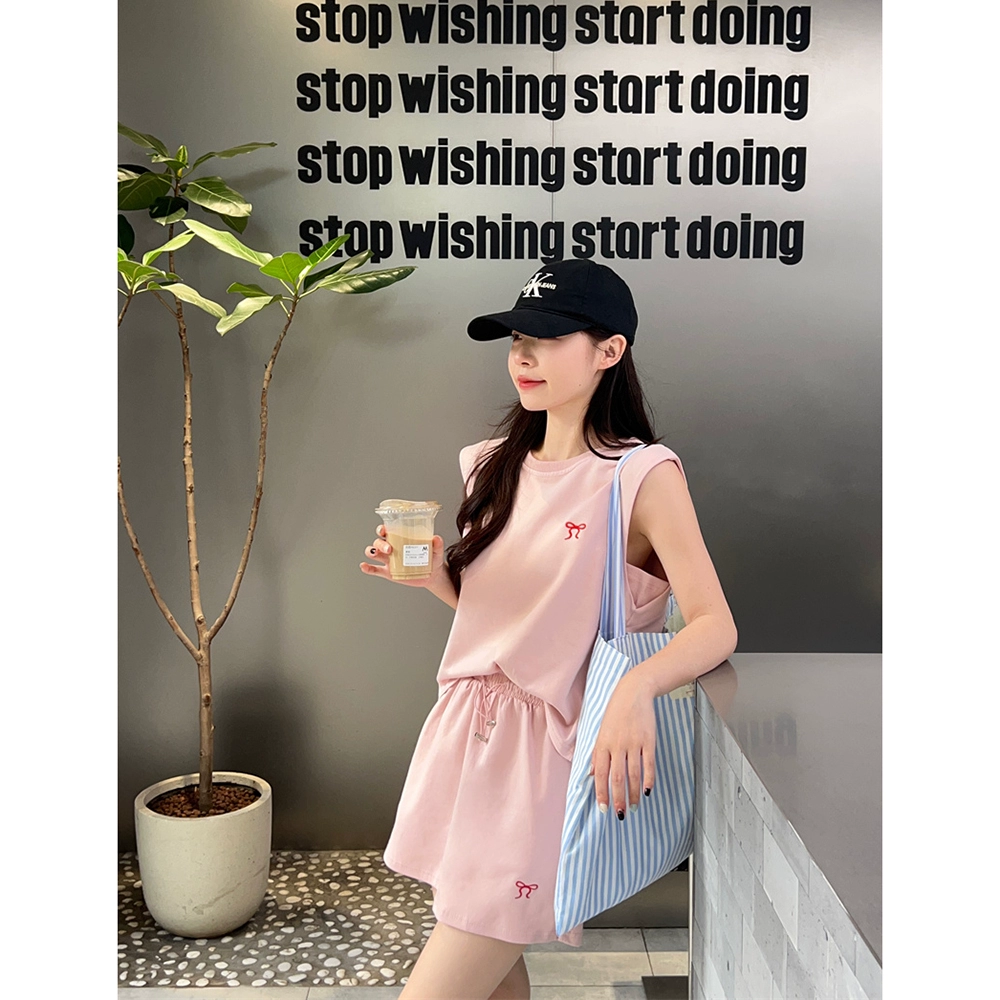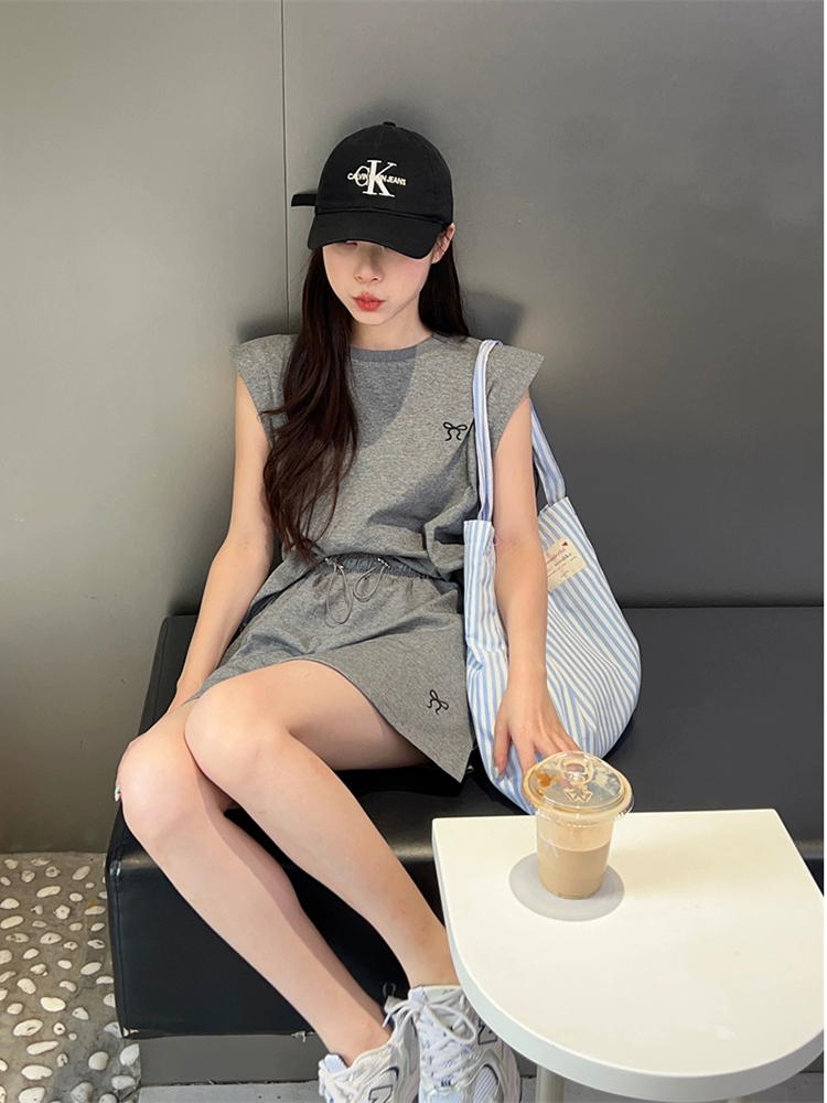 Embroidered sleeveless T-shirt with elastic waist and drawstring A-line bow