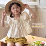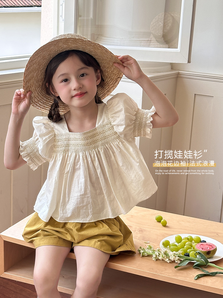 Emo Beibei Children’s French Style Elegant Doll Shirt 2024 Summer New Girls Thin Lace Short Sleeve Shirt