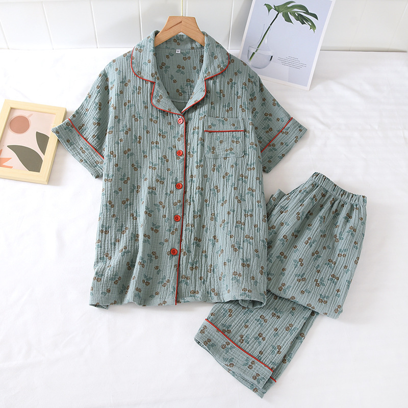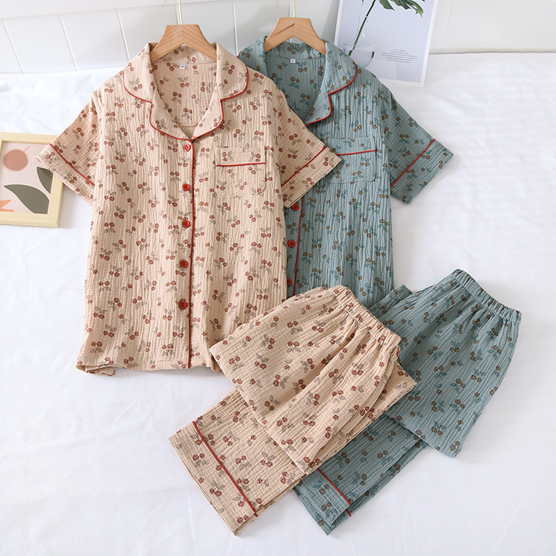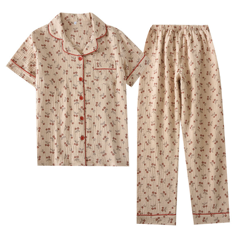 Encrypted Washed Crepe Double Gauze Cotton Pajamas Women's Suit Short-sleeved Trousers Home Clothes Spring and Autumn Thin Suit