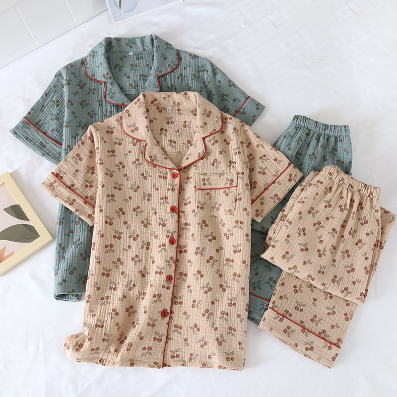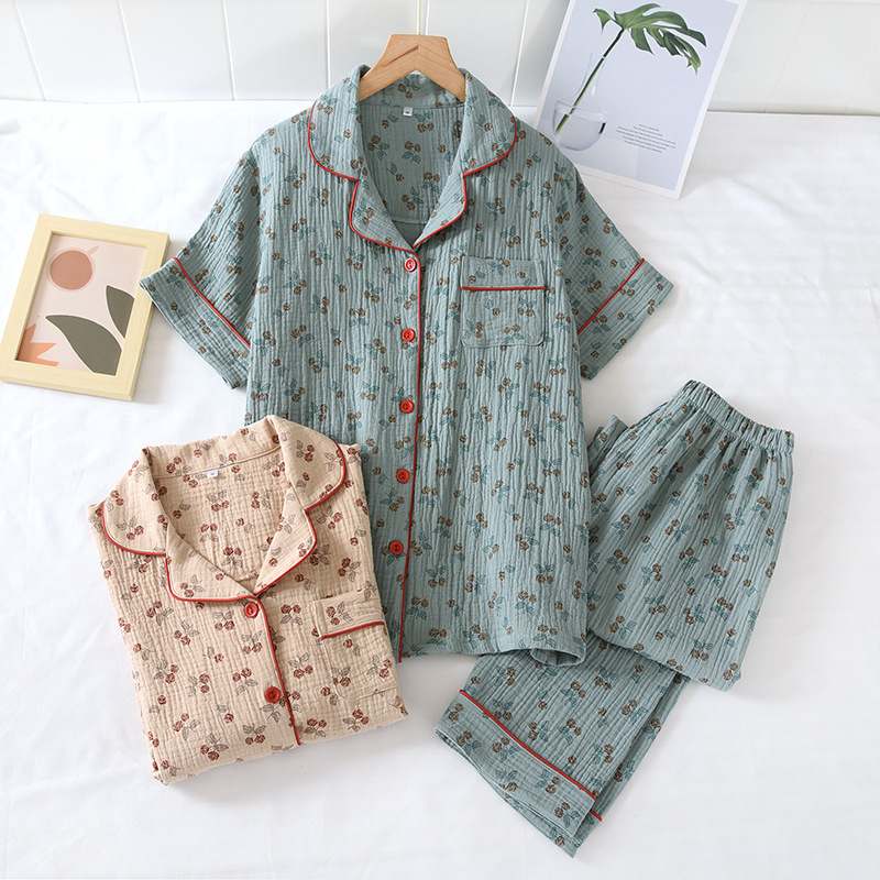 Encrypted Washed Crepe Double Gauze Cotton Pajamas Women’s Suit Short-sleeved Trousers Home Clothes Spring and Autumn Thin Suit