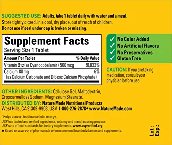 The Nature Made Vitamin B12 500 mcg Tablets are an excellent source of energy for your body throughout the day. Made from high-quality ingredients, this B12 supplement is gluten-free and contains no artificial flavors, colors, or preservatives. This dietary supplement helps support energy metabolism and is especially beneficial for vegetarians and vegans who may not consume enough B12 from their diet alone. To use, simply take one tablet daily with water and a meal. Nature Made is a trusted brand that ensures quality through USP testing and verification of ingredients, potency, and manufacturing processes. Visit the USP verified website for more information.