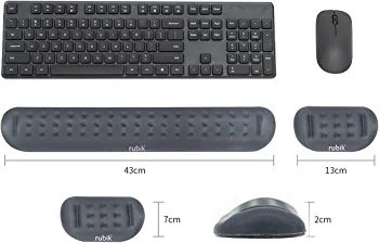 Experience the ultimate comfort and support with our premium memory foam wrist rest. Made with superior quality memory foam, it is designed to withstand long term usage without cracking or splitting. The heat-dissipating fabric and multiple surface pockets provide a cooling effect and prevent heat build up between your hand and wrist pad. This also increases the contact surface for wrist resting to help dissipate heat faster. Our wrist rest is compatible with all full-sized keyboards, including standard size or full-sized keyboards and laptops. The non-slip rubber surface is made from natural rubber, a renewable resource, and effectively keeps the wrist rest in place without the need for stickers. Available in black and grey, our wrist rest is lightweight and also suitable for use with a mouse. The size for the keyboard is 43cm x 7cm (height 2.2cm) and the size for the mouse is 13cm x 7cm (height 2.2cm).