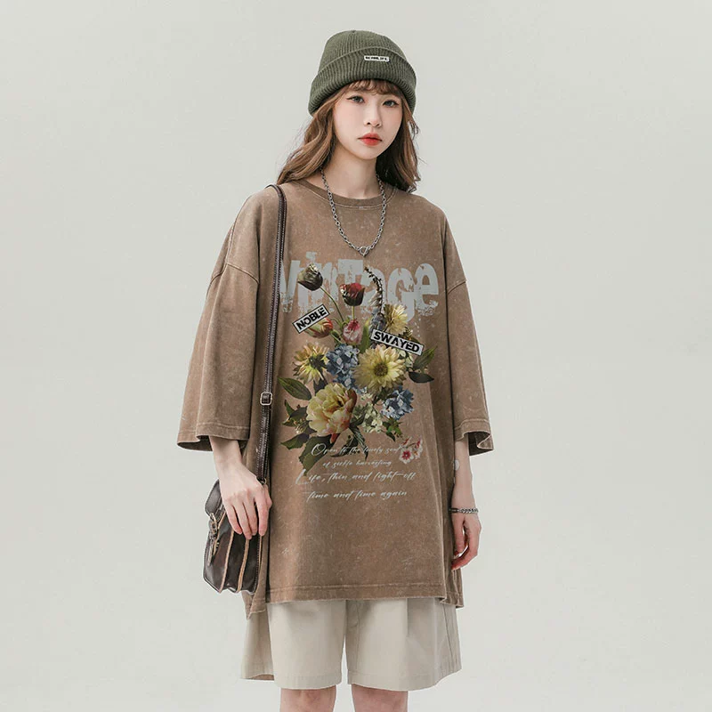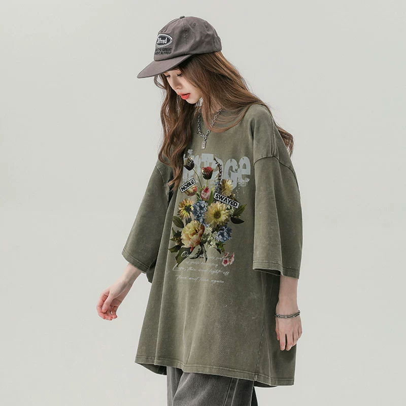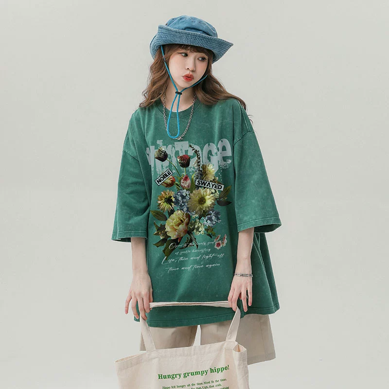| nameOriginal | Escape from the Earth American Retro Plant Flower Short Sleeve T-shirt Women's Summer Trendy Brand Loose Couple Quarter Sleeve T-shirt |