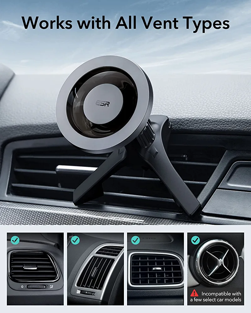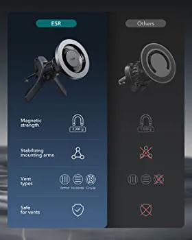 Experience ultimate security while driving with this phone mount that boasts ultra-strong magnets with a holding force of 2,300 g. The high-grade N52H magnets ensure that your phone stays in place even on the bumpiest roads. The mount is designed with a unique hook that fits securely onto any type of air vent, and the mounting arms provide additional stability. You can adjust the viewing angle to your preference with the 360° rotatable mounting head and precision ball joint, allowing for portrait or landscape mode. The mount is compatible with all vent types, and installation is made easy with the HaloLock system. Choose from a variety of wireless car chargers, kickstand wireless chargers, phone ring stands, and mini wireless chargers to find the perfect fit for your needs.