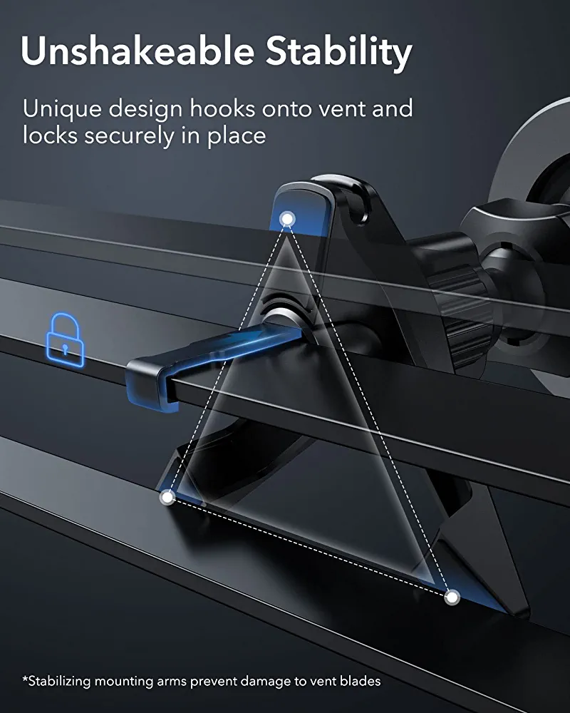 The uniquely designed mounting hook enables a reassuringly secure, strong fit to any type of air vent, with mounting arms for that extra level of stability. Once installed, you’ll enjoy a smooth and steady phone screen over even the bumpiest roads.