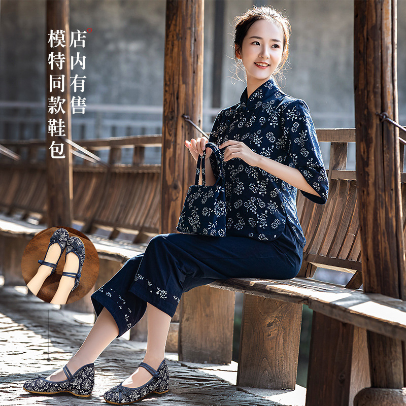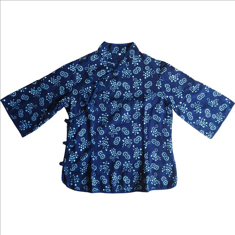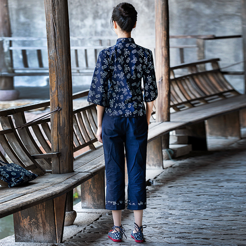 | nameOriginal | Ethnic Style Blue Printed Cloth Slant Placket Spring and Autumn Cotton Seven-point Horn Sleeve Suit Farmhouse Clothing Professional Suit |