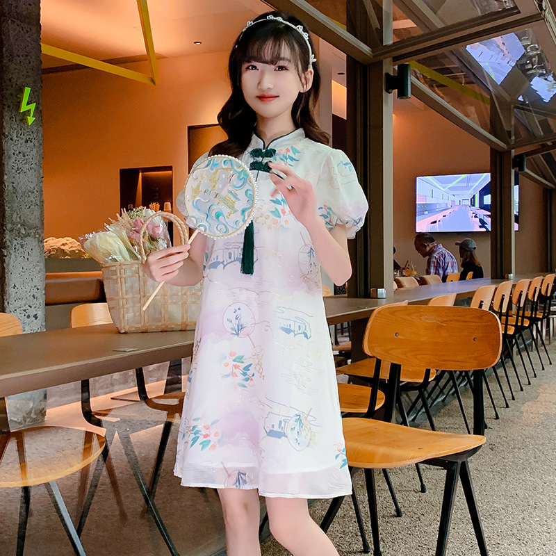 Ethnic Style Girl’s Improved Cheongsam Dress 2024 Summer New Style Girl’s Cheongsam Dress in Jiangnan Watertown Big Girl