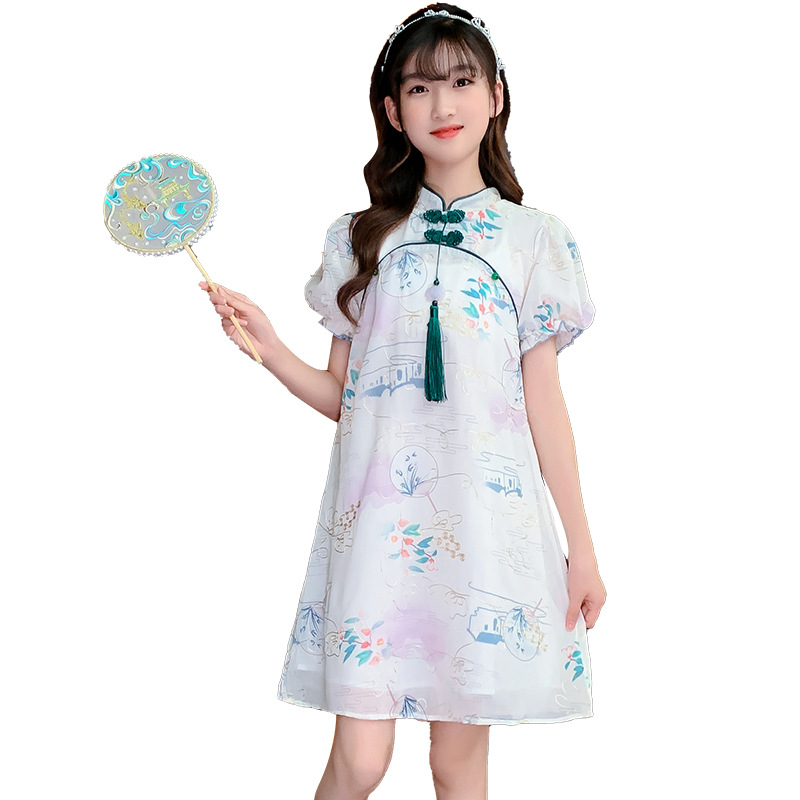 Ethnic Style Girl's Improved Cheongsam Dress 2024 Summer New Style Girl's Cheongsam Dress in Jiangnan Watertown Big Girl