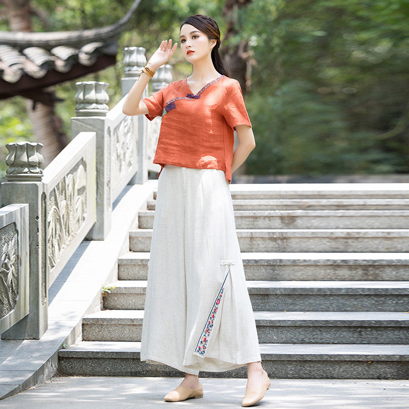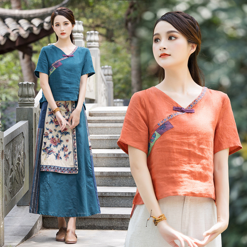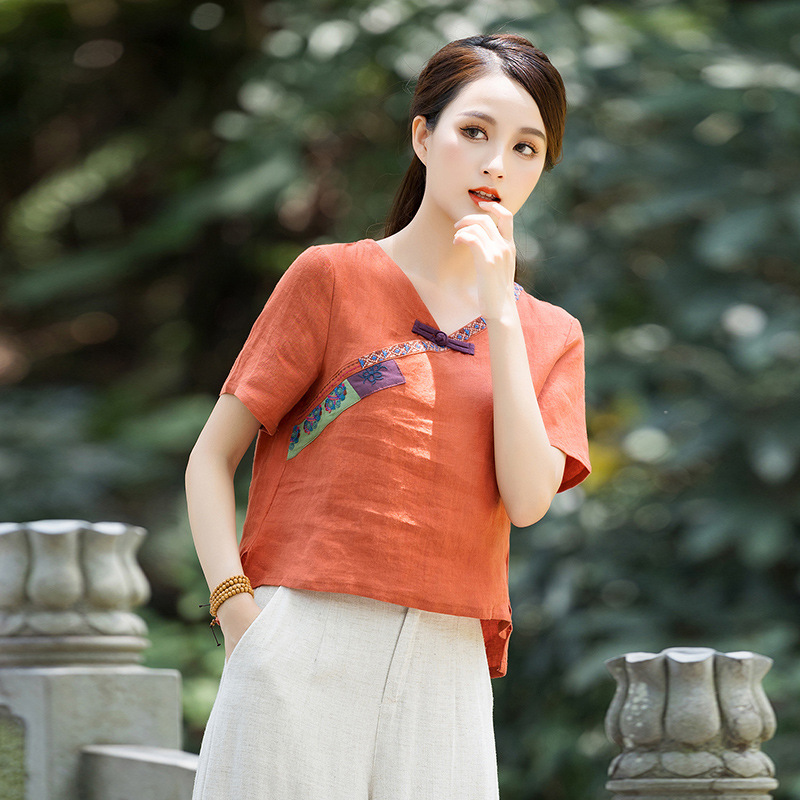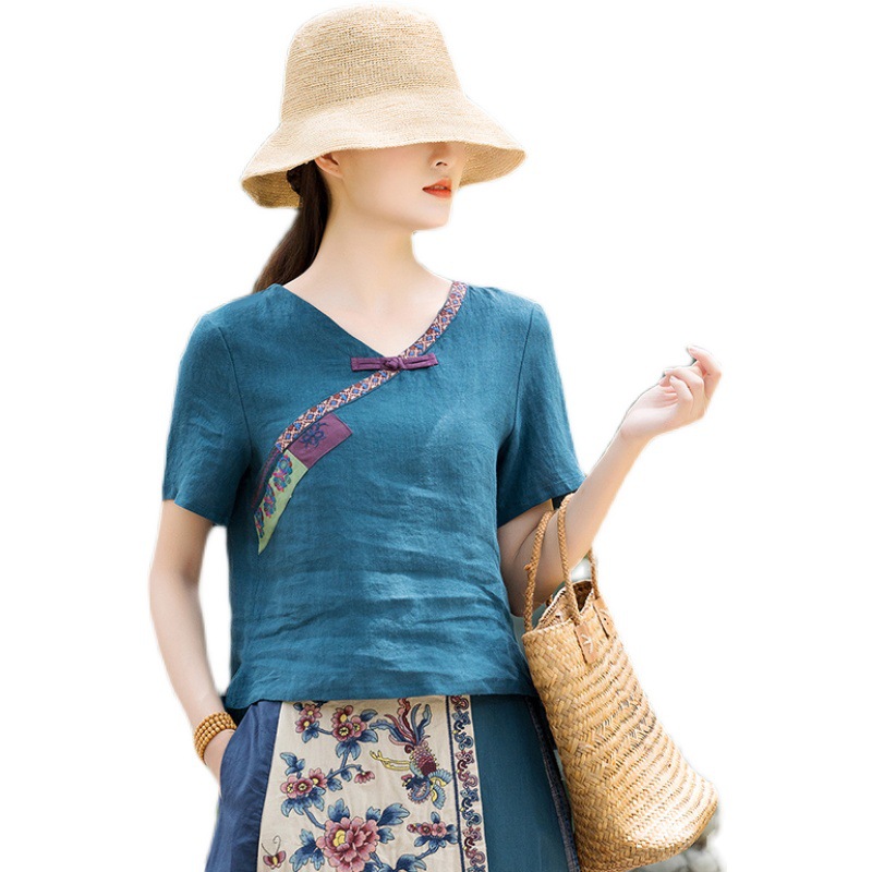 Ethnic Style Short-sleeved Vintage V-neck Embroidered Pure Linen Young Top Ethnic Style Embroidered Shirt