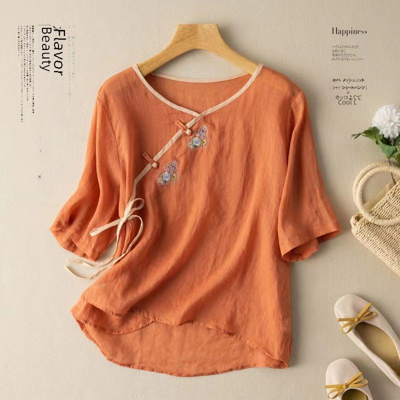 | nameOriginal | Ethnic Style Slant Placket Buckle Embroidered Short-sleeved Cotton and Linen Top Women's 2024 Summer New Large Size Loose Shirt Trend |