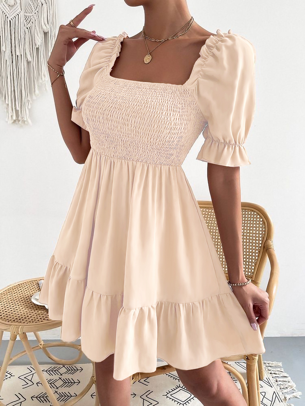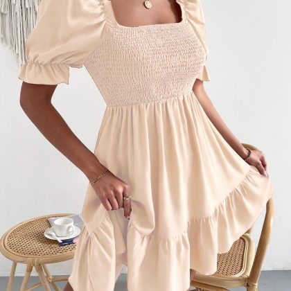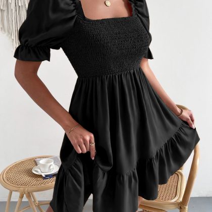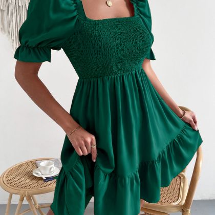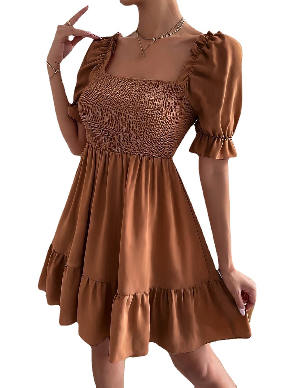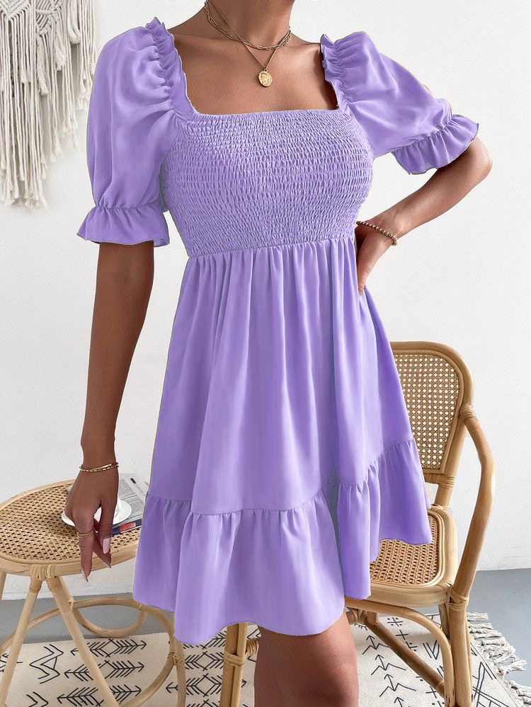 European and American 2023 Amazon Spring and Summer Hot Square Collar Ruffled Short Sleeve High Waist Tight Elegant Commuter Dress for Women