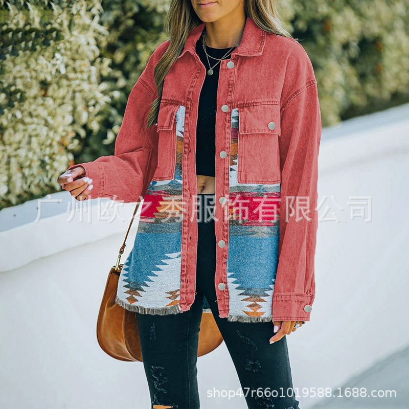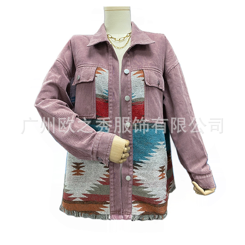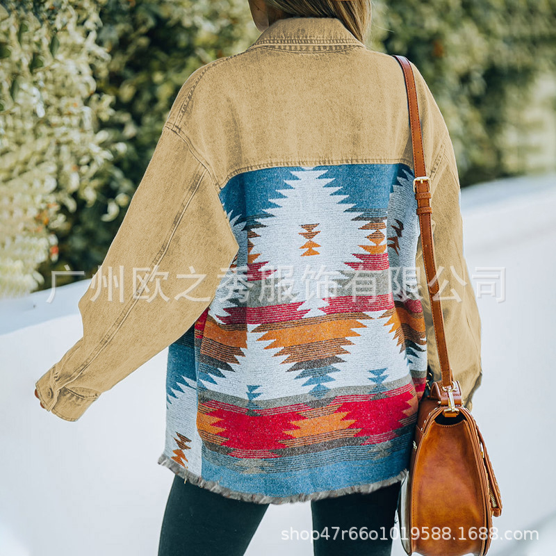 European and American 2023 Autumn and Winter Wool Stitching Denim Jacket Women's Cross-border Clothing Long-sleeved Vintage AZTEC Ethnic Style