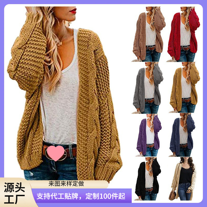 European and American 2023 Spring and Autumn New Coarse Needle Twist Knitted Cardigan Women's Mid-length Solid Color Casual Loose Coat Cardigan
