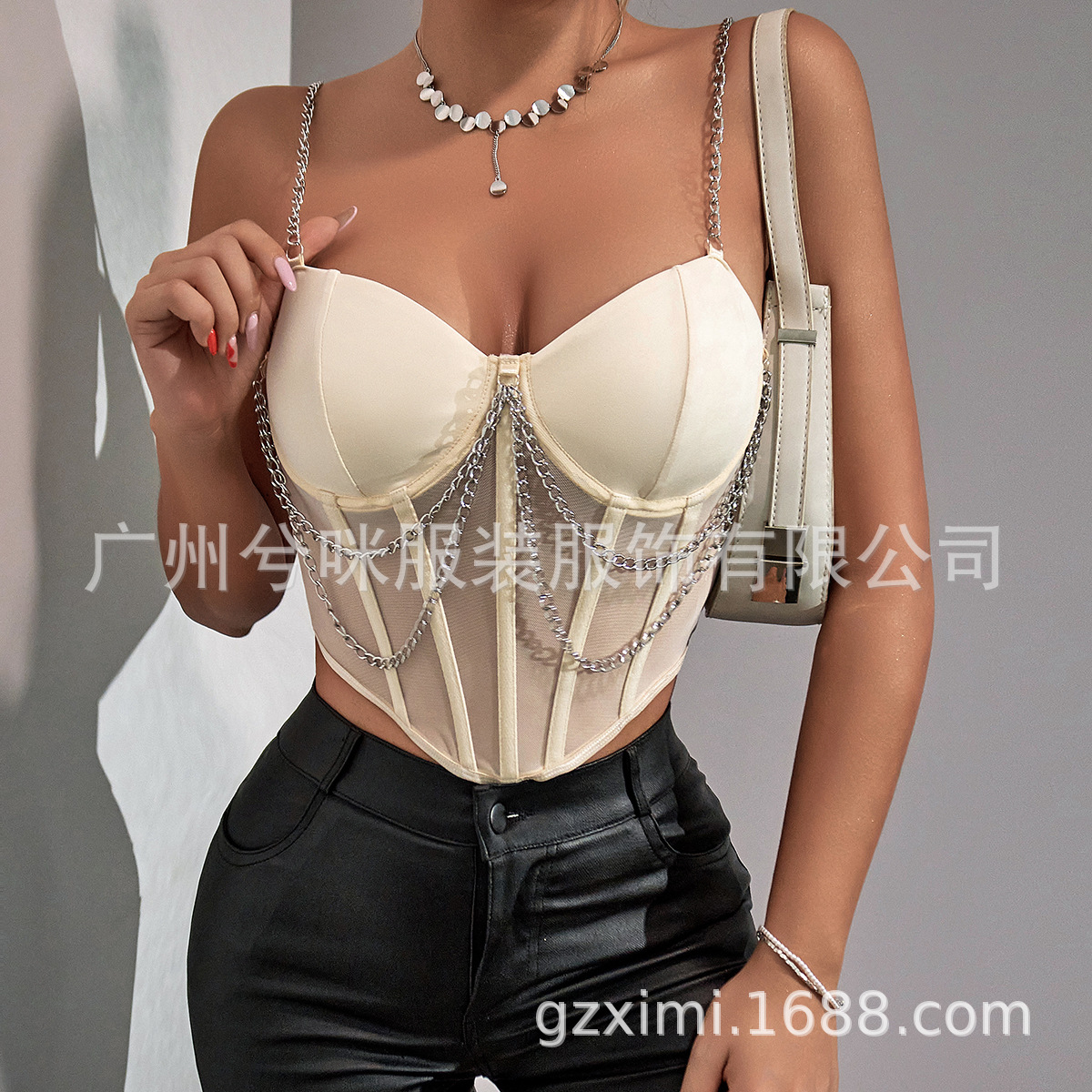 | nameOriginal | European and American 2023 Summer Street hot girl mesh transparent deep V irregular steel ring Fishbone backless chain sling A986 |