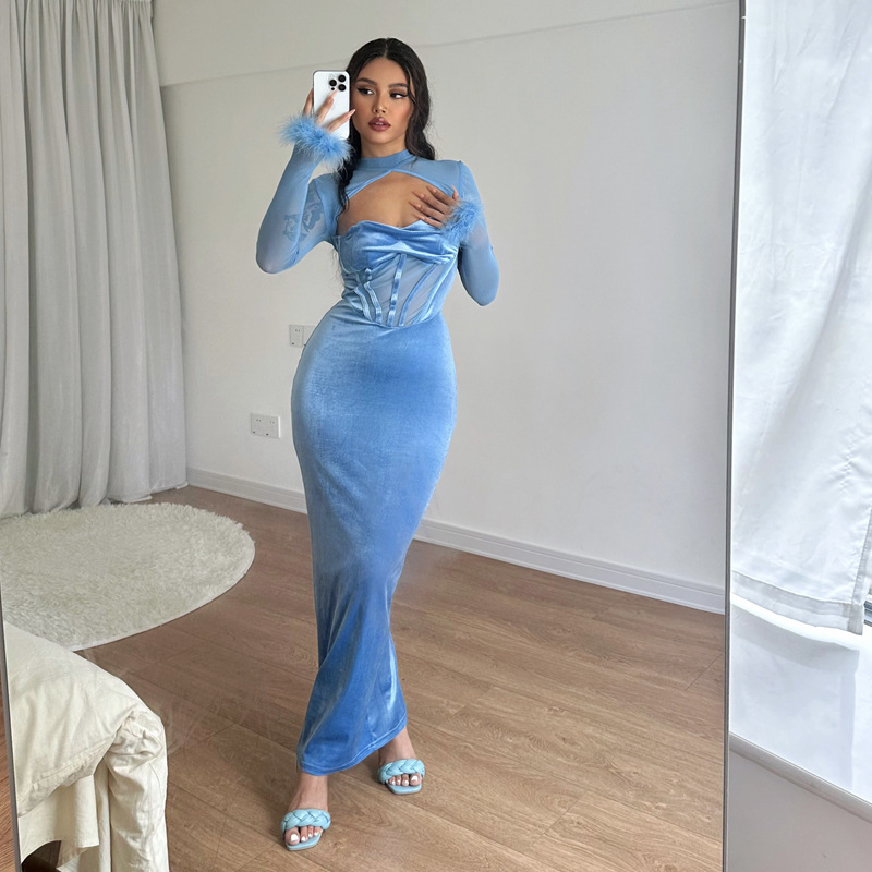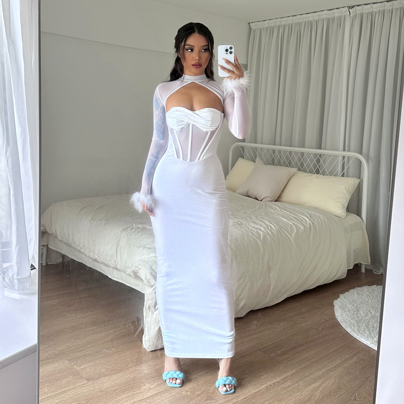 | nameOriginal | European and American 2023 Winter Women's Clothing New Plush Mesh Stitching Sexy Nightclub Style Hollow-out Long Dress Slim-fit Dress |