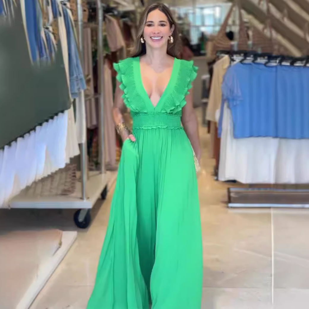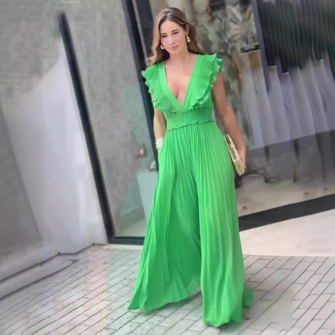 European and American 2024 New Women’s Summer Design Sense Jumpsuit Lace Deep V Green High-grade Sense Wide-leg Jumpsuit