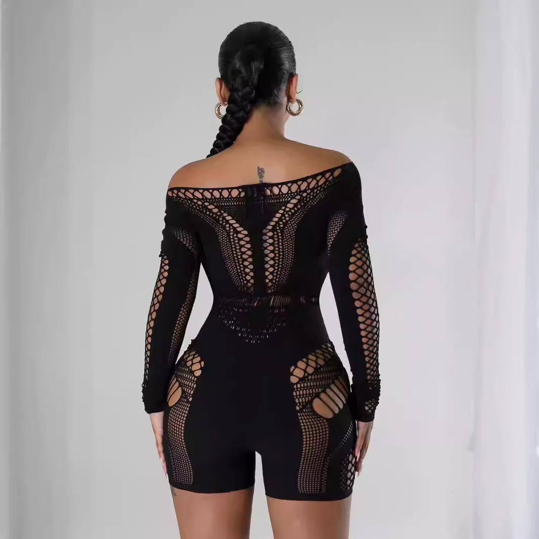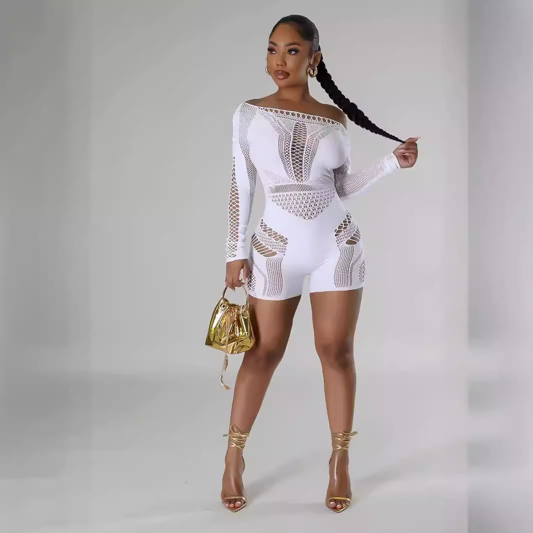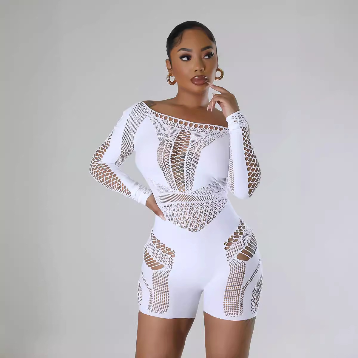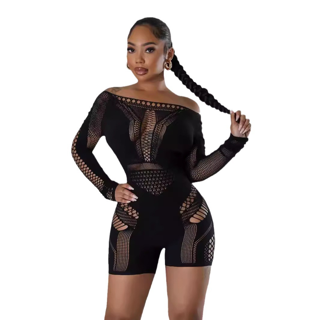 | nameOriginal | European and American 2024 Summer New Solid Color Women's Long Sleeve Hollow Perspective Mesh Clothes Sexy High Elastic Jumpsuit Women's Shorts |