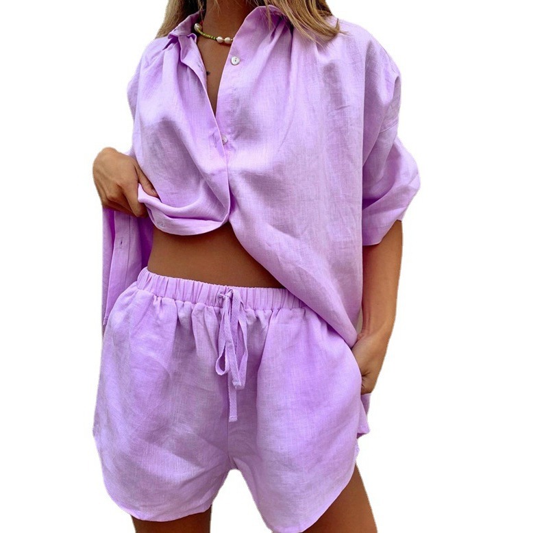 | nameOriginal | European and American 2024 Summer New Women's Solid Color Single-breasted Short-sleeved Shirt Two-piece Wide-leg Pants Lace-up Shorts |