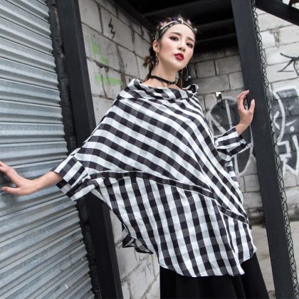 European and American 2024 Thin Women’s Plaid Shirt Large Size Personalized One-character Collar Irregular Stitching BF Style Niche Trendy T