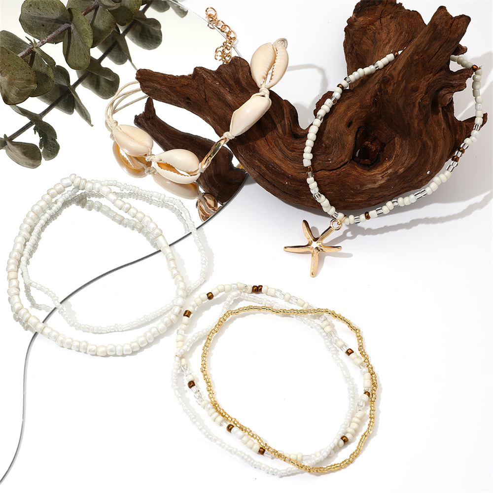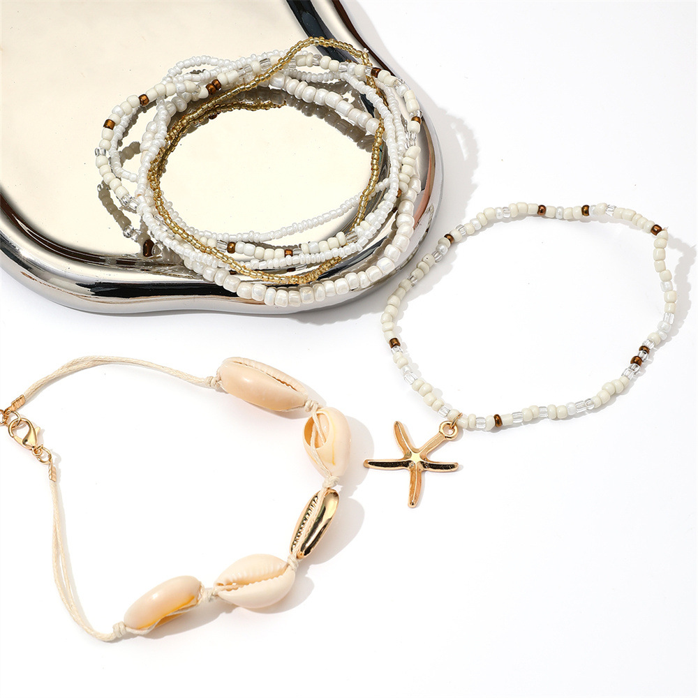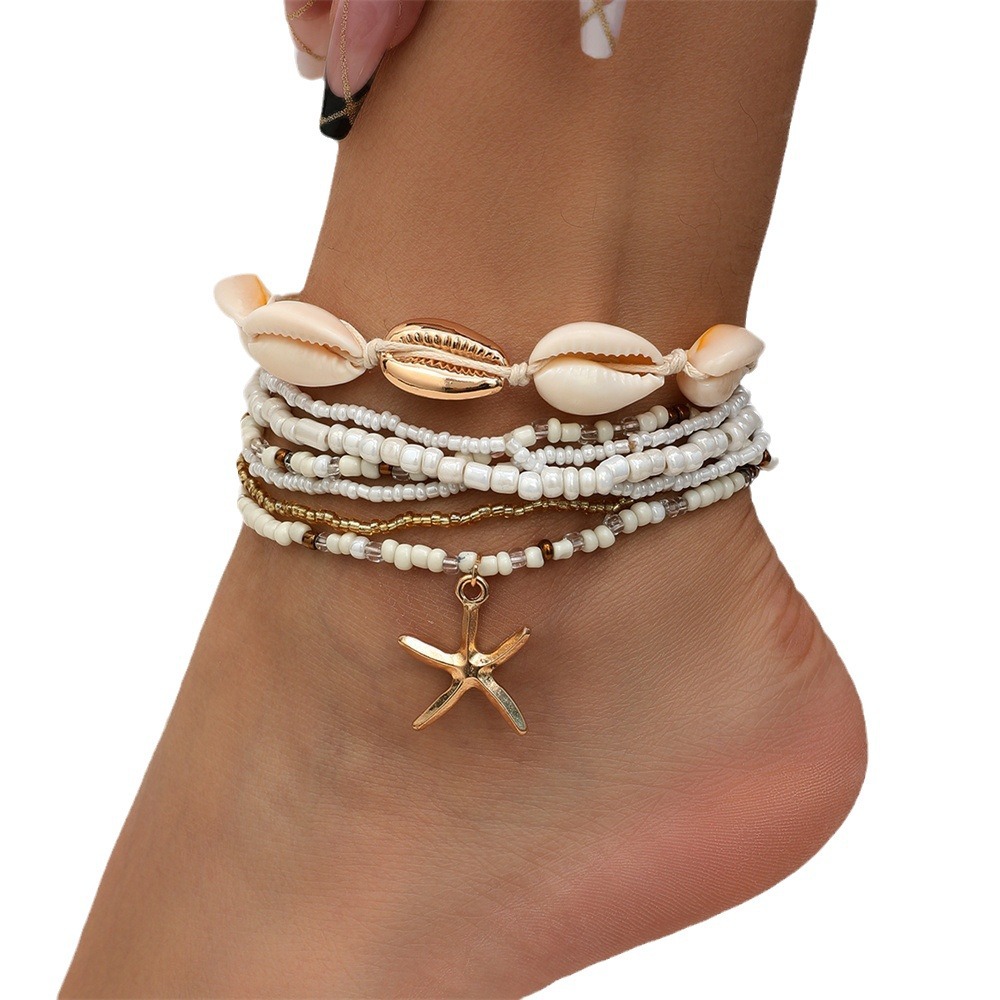 European and American cross-border bohemian style Foreign trade starfish woven anklet summer beach shell rice beads foot decoration 6-piece set