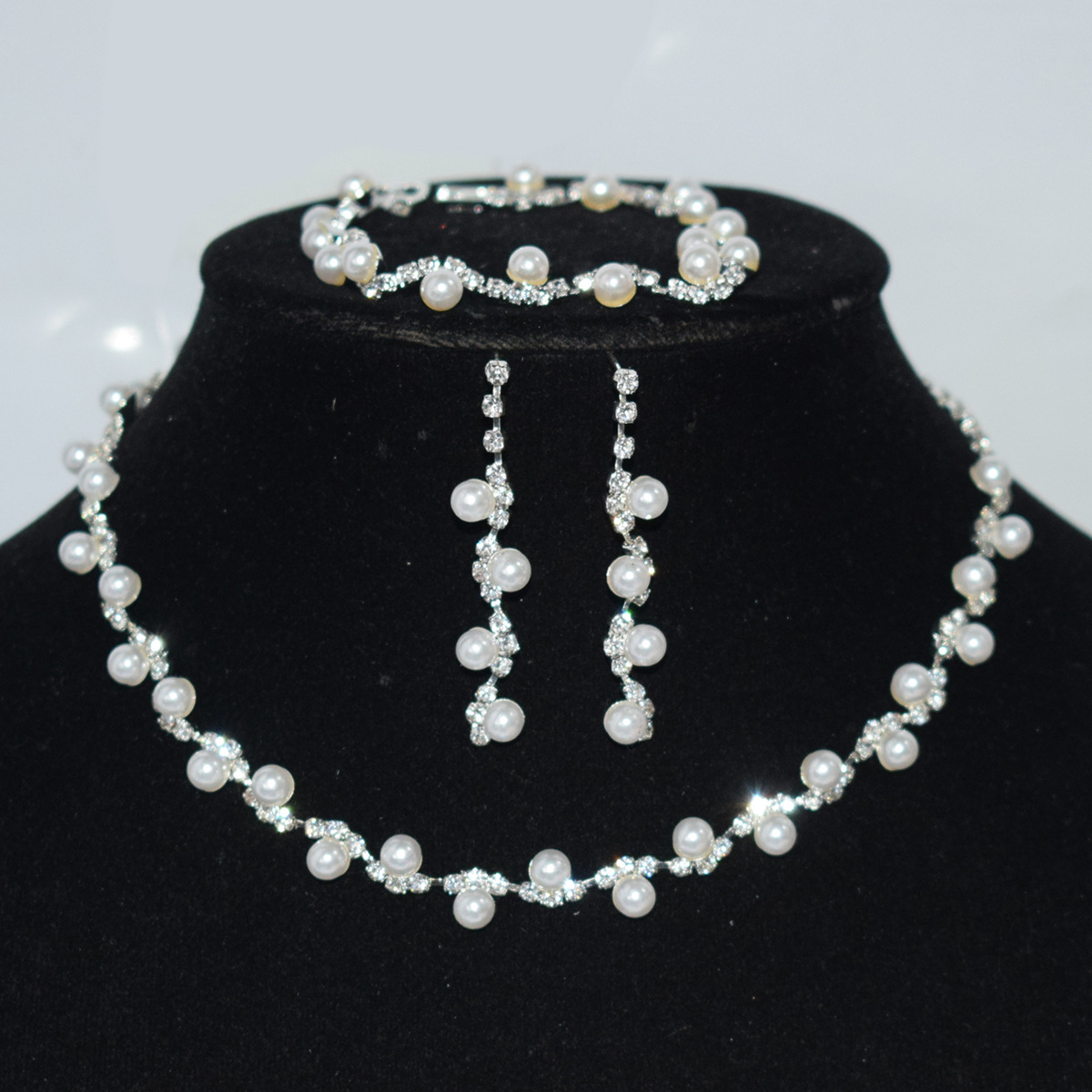 | nameOriginal | European and American Cross-border Bridal Jewelry All-match Rhinestone Pearl Set Necklace Earrings Bracelet Three-piece Set Women's Wedding Accessories |