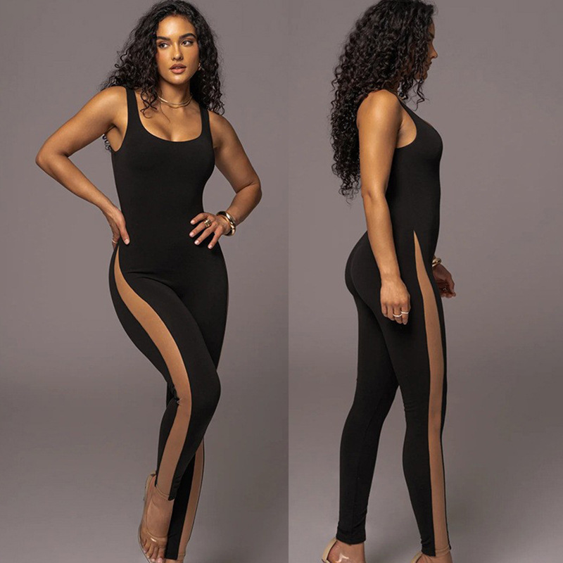 European and American cross-border foreign trade women's clothing 2023 spring and autumn I-shaped vest jumpsuit Sexy Slim mesh stitching jumpsuit