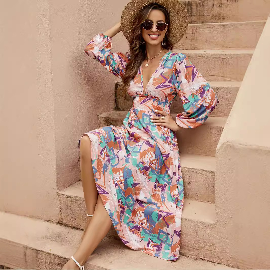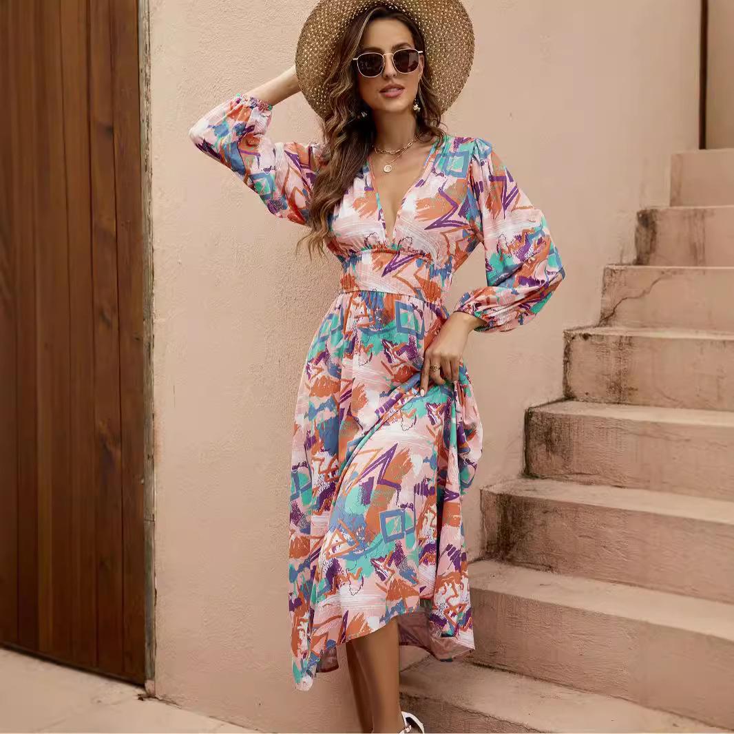 | nameOriginal | European and American Cross-border Foreign Trade Women's Multicolor Irregular Geometric Printing Deep V Waist Lantern Long Sleeve Large dress |