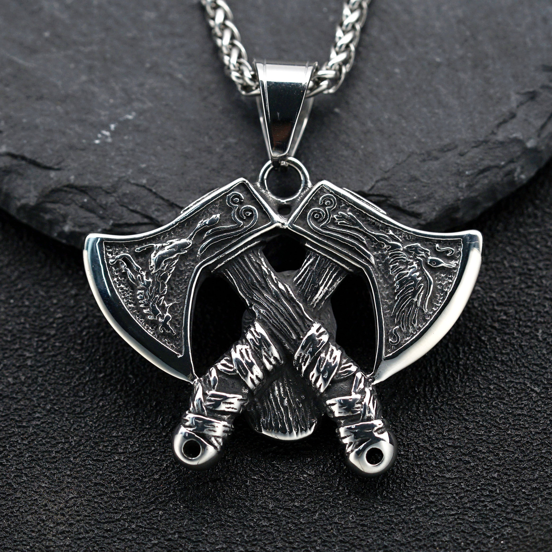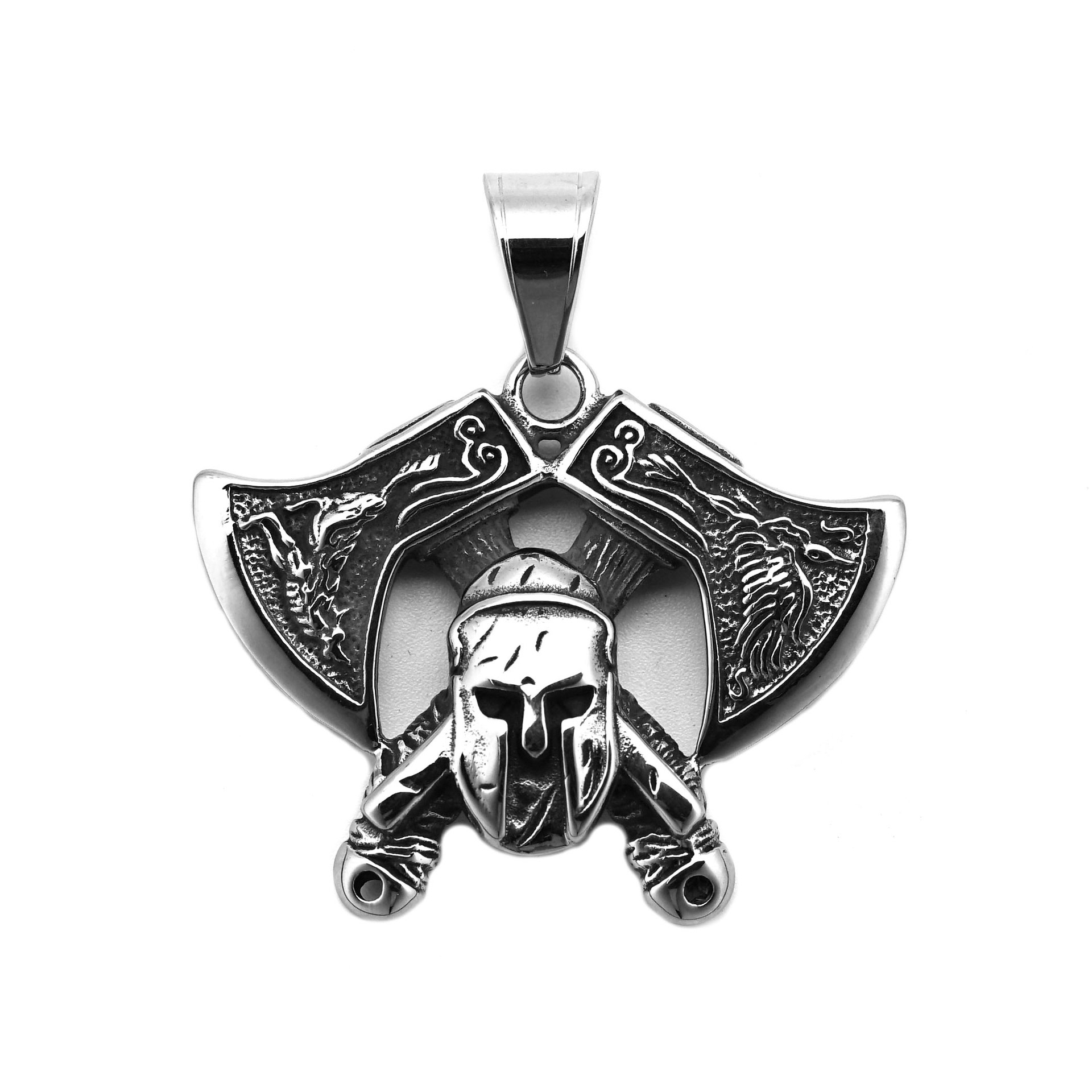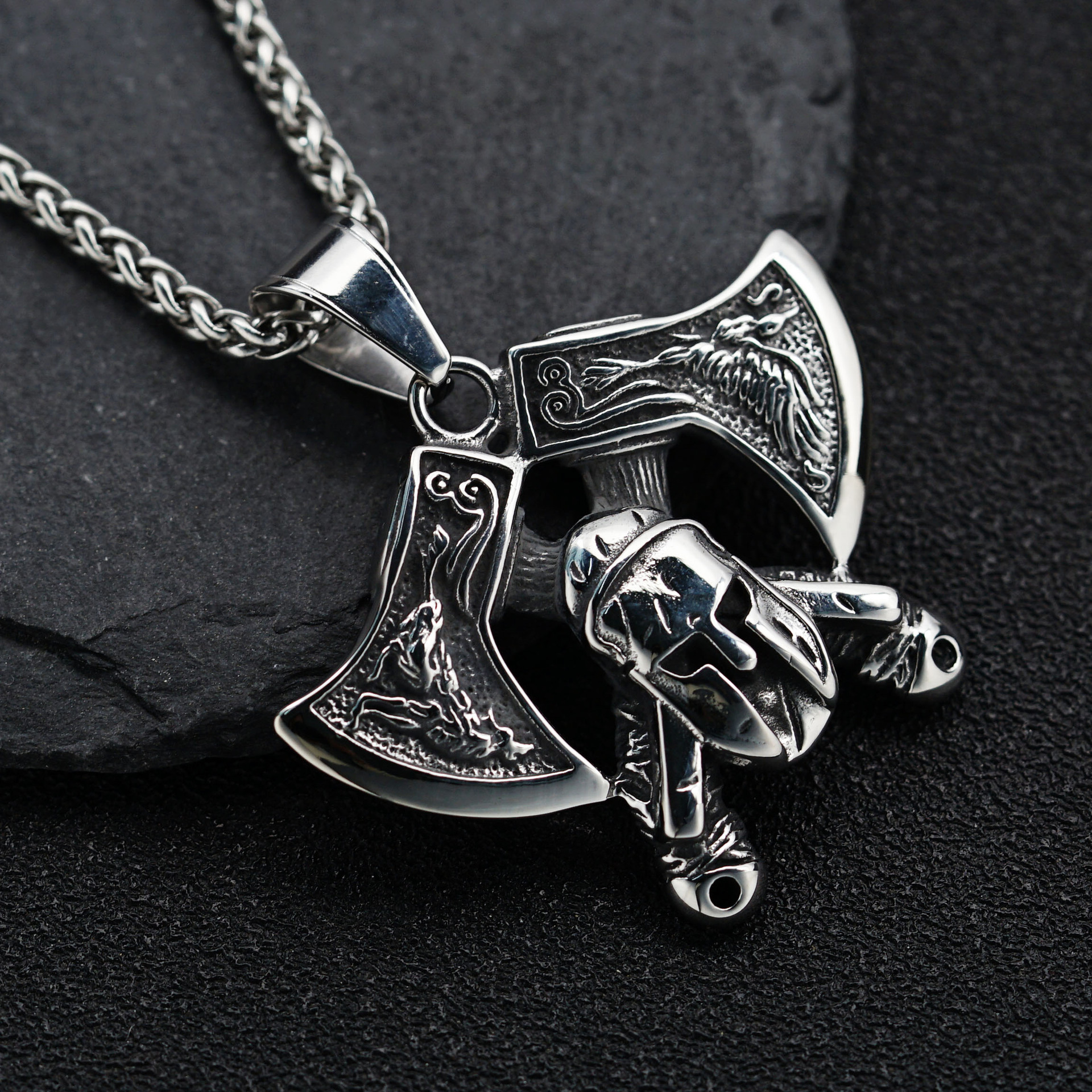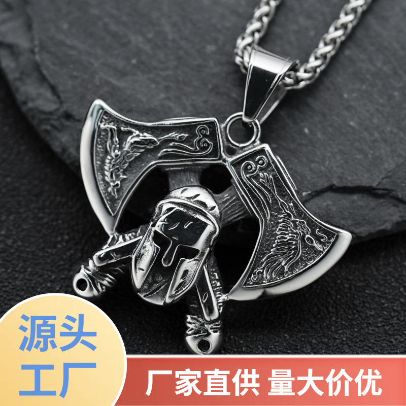 | nameOriginal | European and American Cross-border Retro Nordic Viking Double Axe Mask Warrior Pendant Men's Titanium Steel Necklace Pendant |