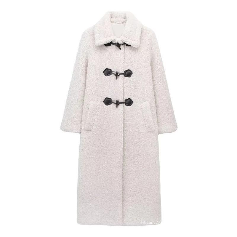 European and American Cross-border Women’s 2023 Winter New British Style Rope Buckle Fleece Coat Thick Loose Over-the-knee Jacket