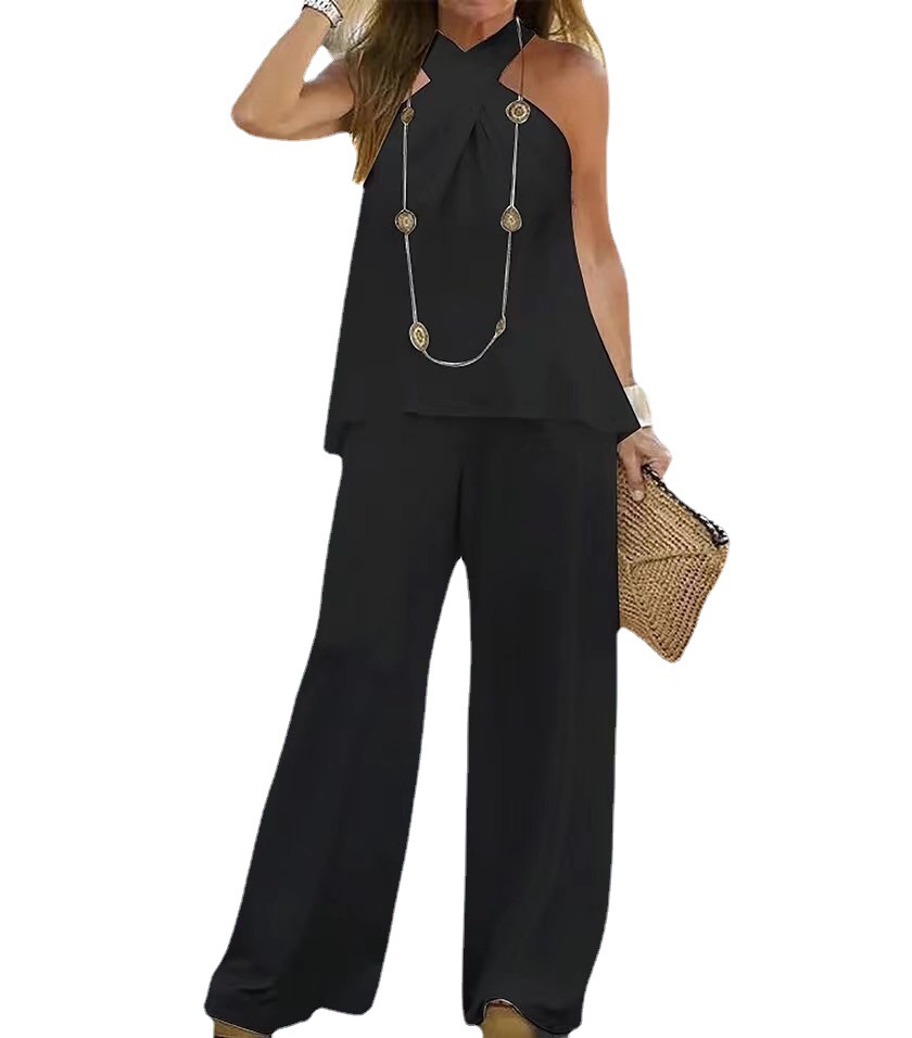 | nameOriginal | European and American cross-border women's clothing 2023 new fashion casual halter solid color sleeveless suit wide leg pants trousers two-piece set |