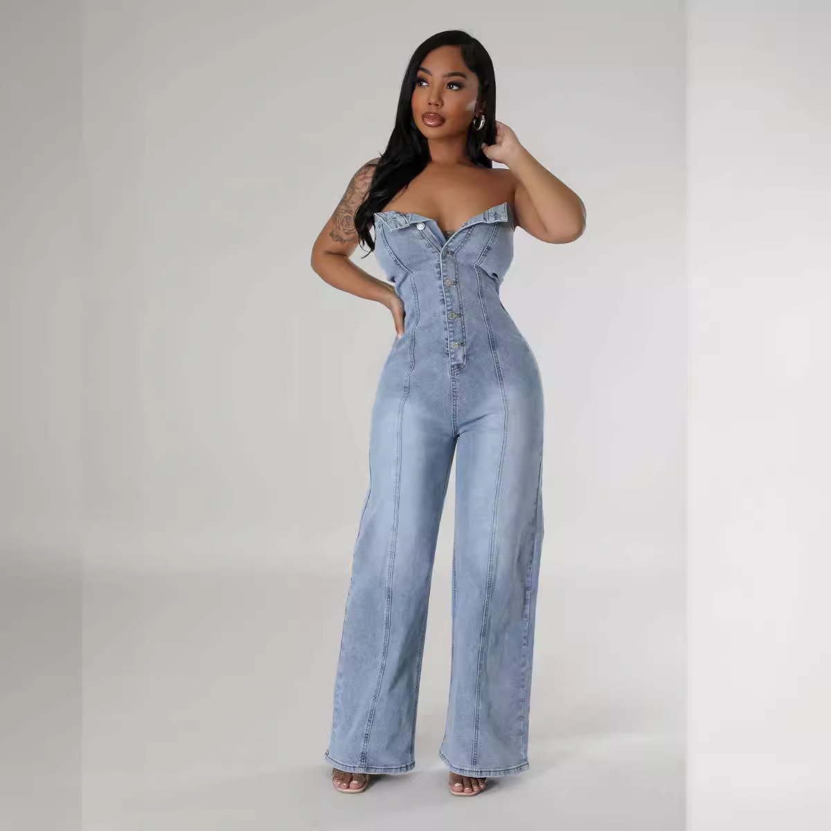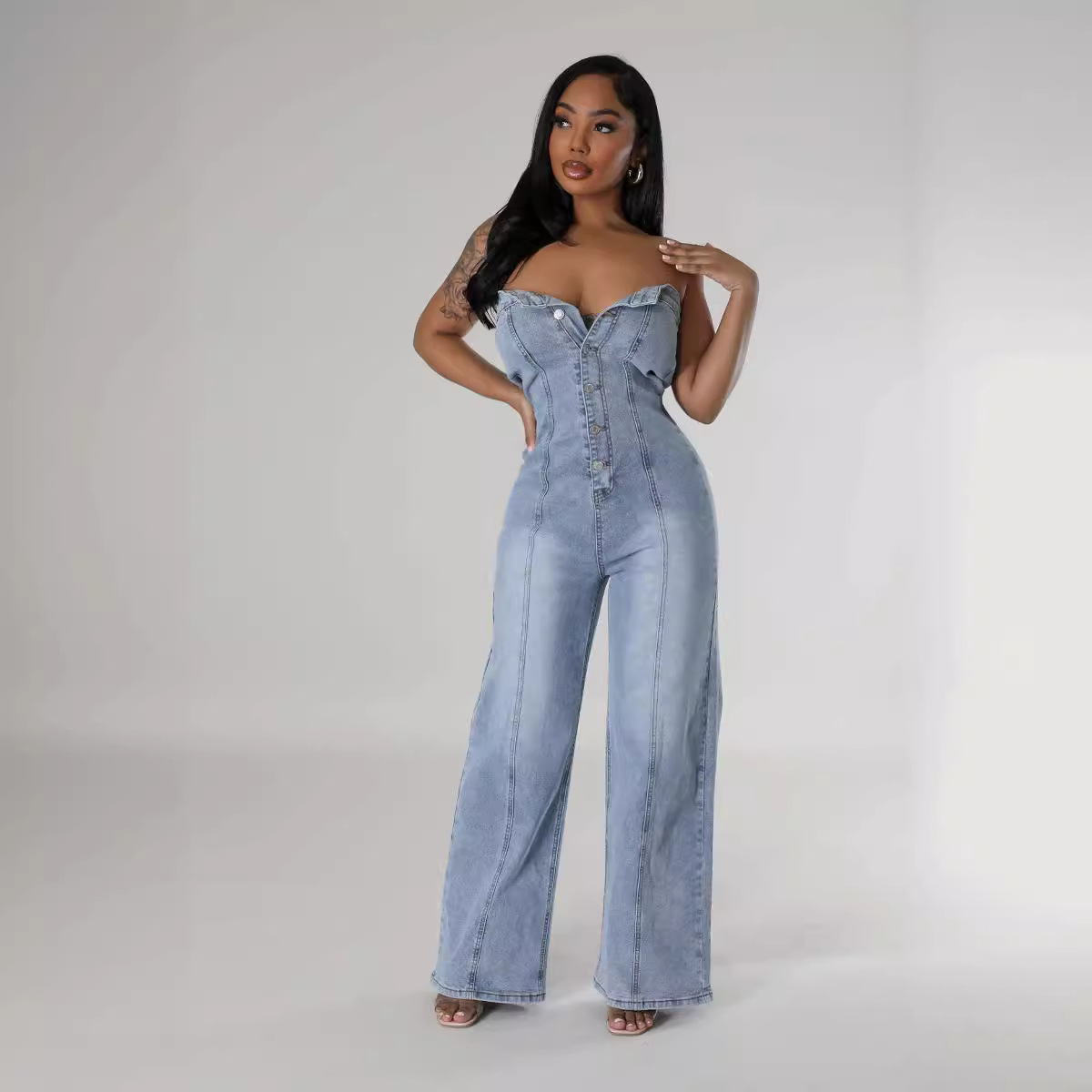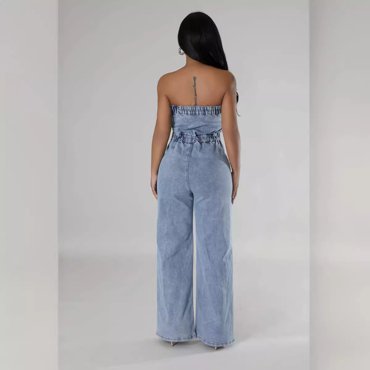 European and American Denim jumpsuit women’s 2024 new foreign trade slim fit tube top jumpsuit one-piece wide leg pants washed elastic jumpsuit