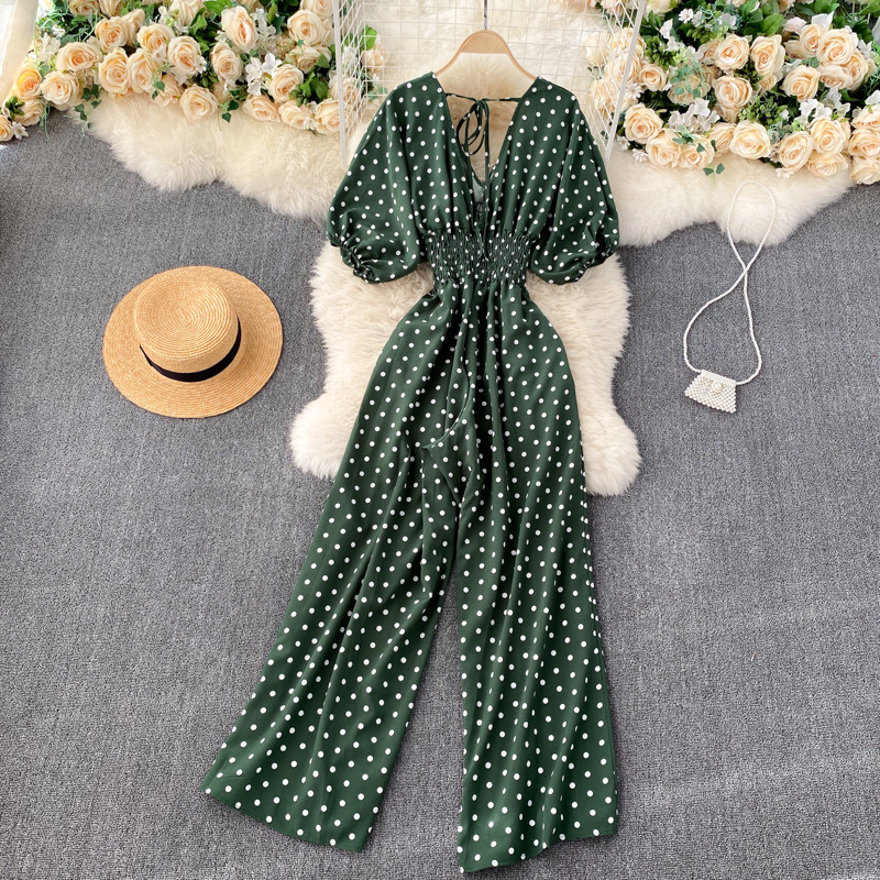 | nameOriginal | European and American Fashion Blogger Private Clothing Holiday Style Wave Dot Bubble Sleeve Tight Waist Slim Long Wide Leg Pants |