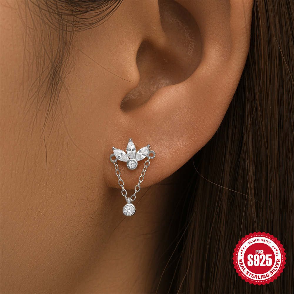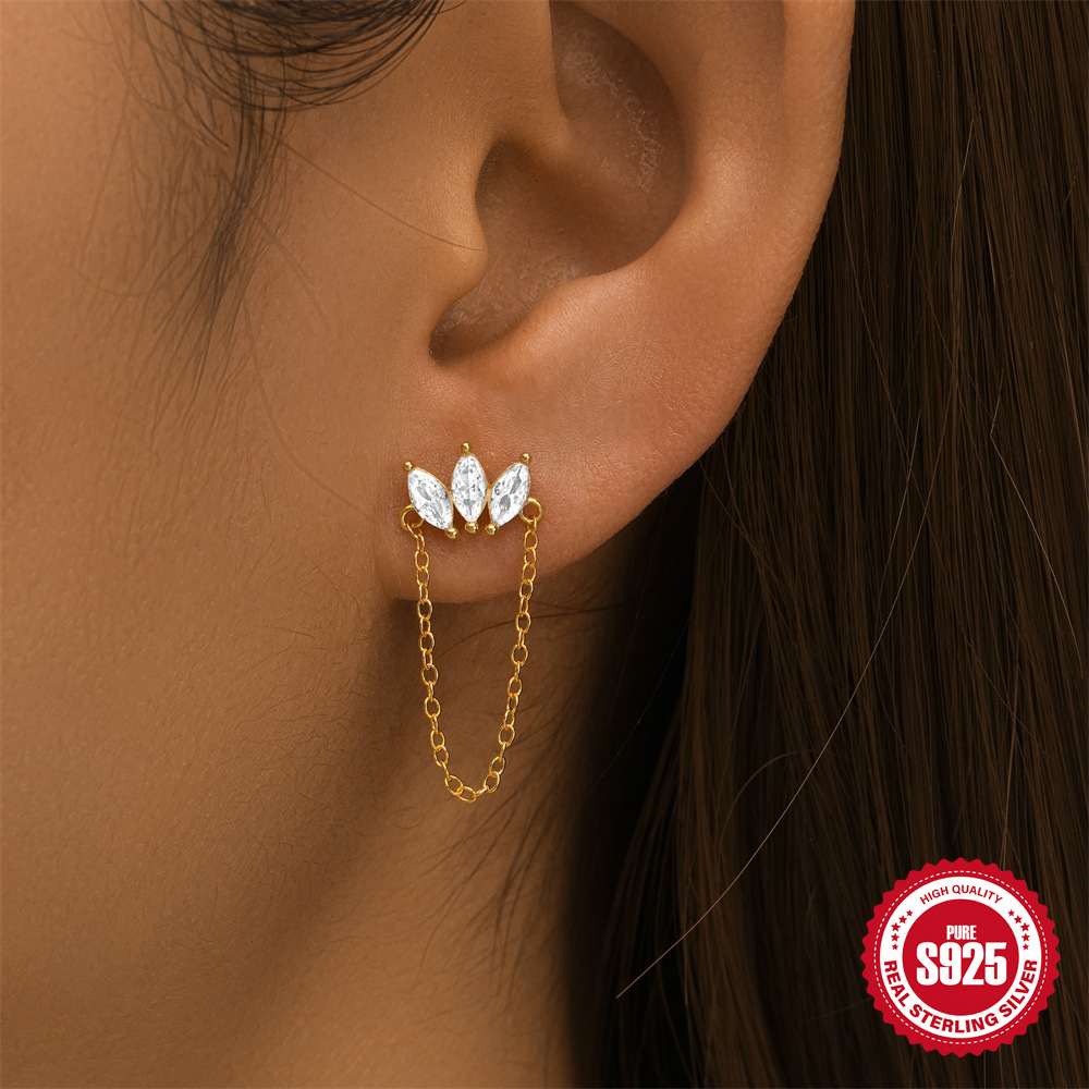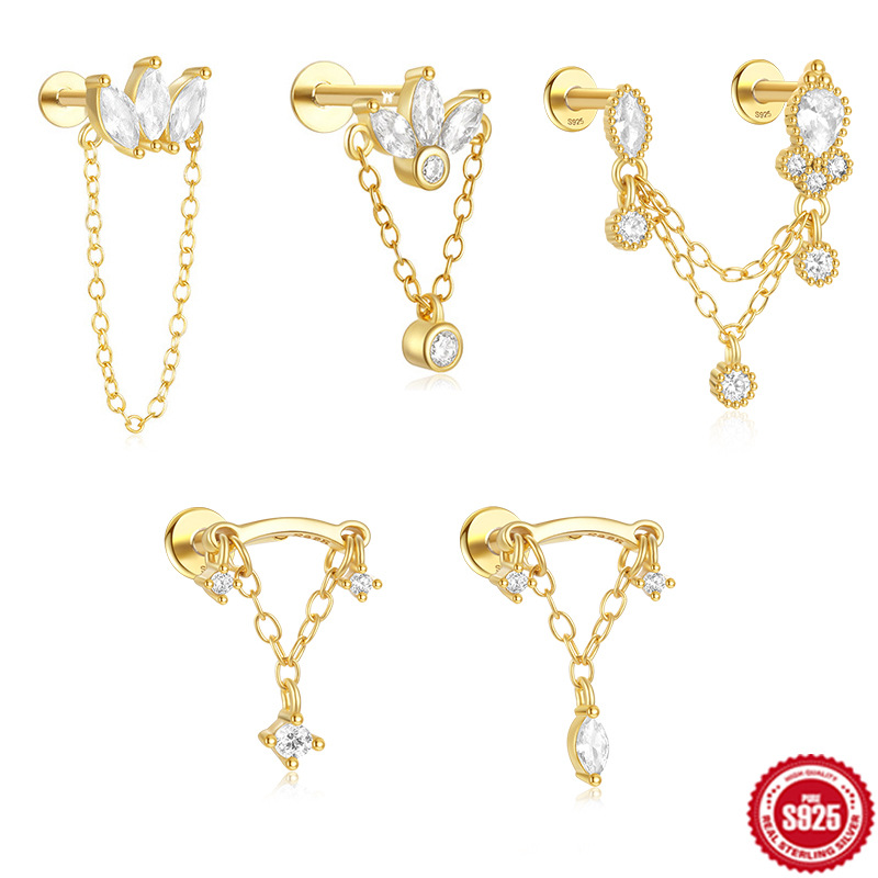 European and American fashion Joker s925 sterling silver three diamond-encrusted horse eye tassel cartilage spiral 16G puncture earrings