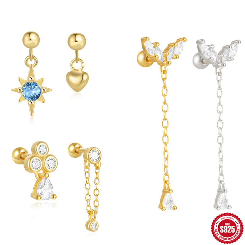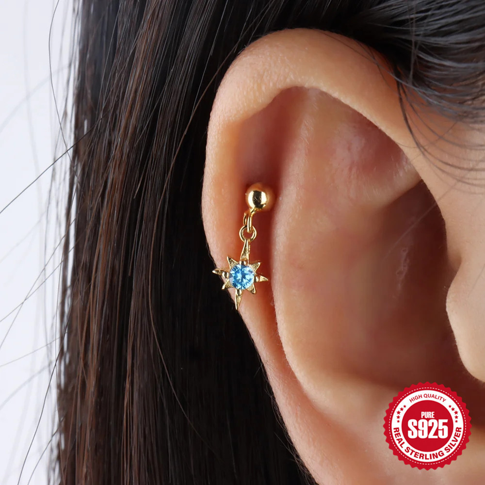 European and American fashion simple s925 sterling silver blue diamond star ball thread ear bone nail small pendant