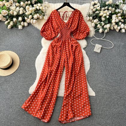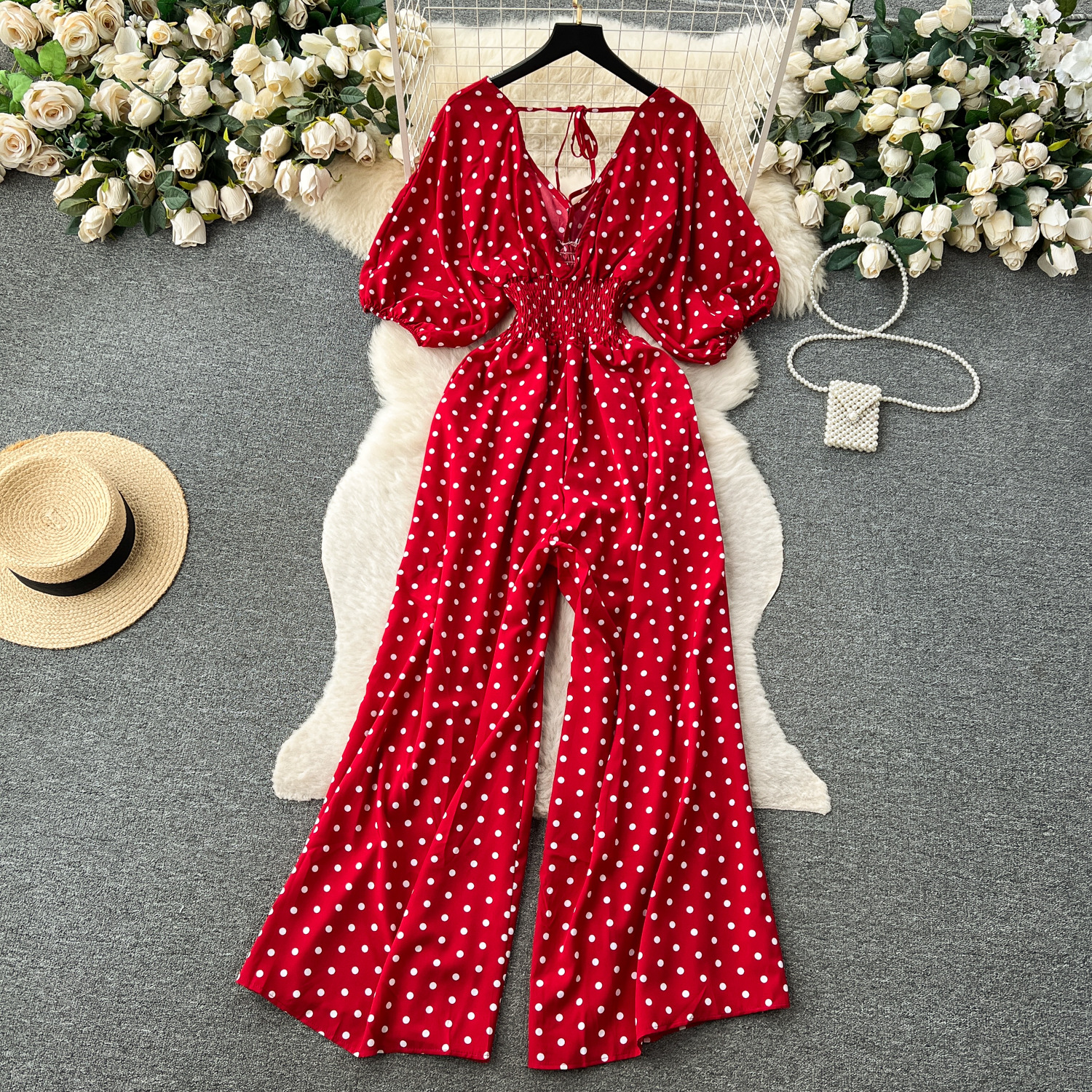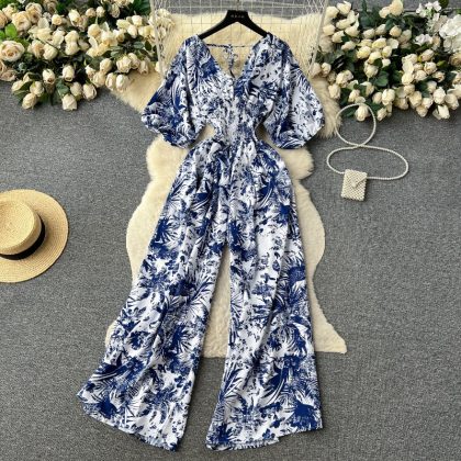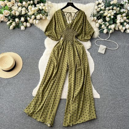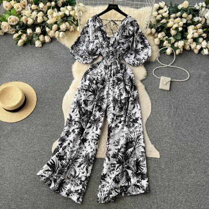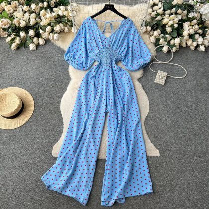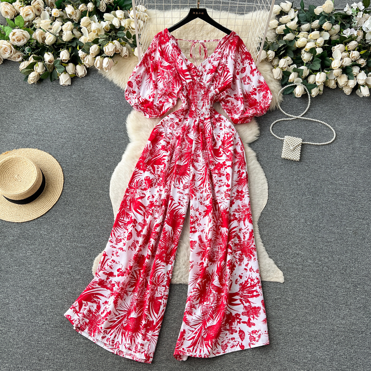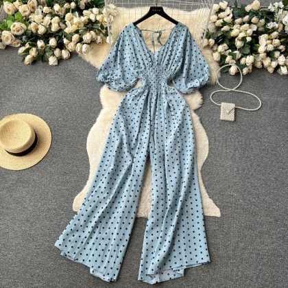 | nameOriginal | European and American ins holiday style jumpsuit women's long age-reducing puff sleeve elastic waist slimming wide-leg pants for women Summer |