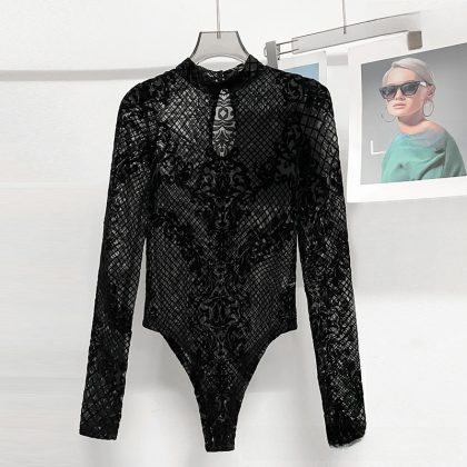 European and American ins2023 Autumn and Winter Explosions Slim-fit All-match Embroidered Long-sleeved High-end T-shirt Lace Base Shirt Women’s jumpsuit
