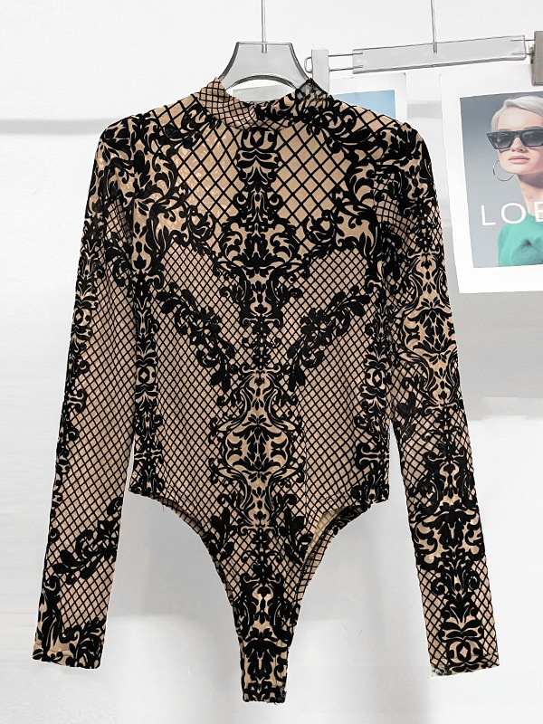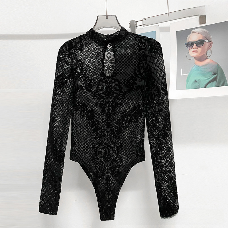European and American ins2023 Autumn and Winter Explosions Slim-fit All-match Embroidered Long-sleeved High-end T-shirt Lace Base Shirt Women's jumpsuit