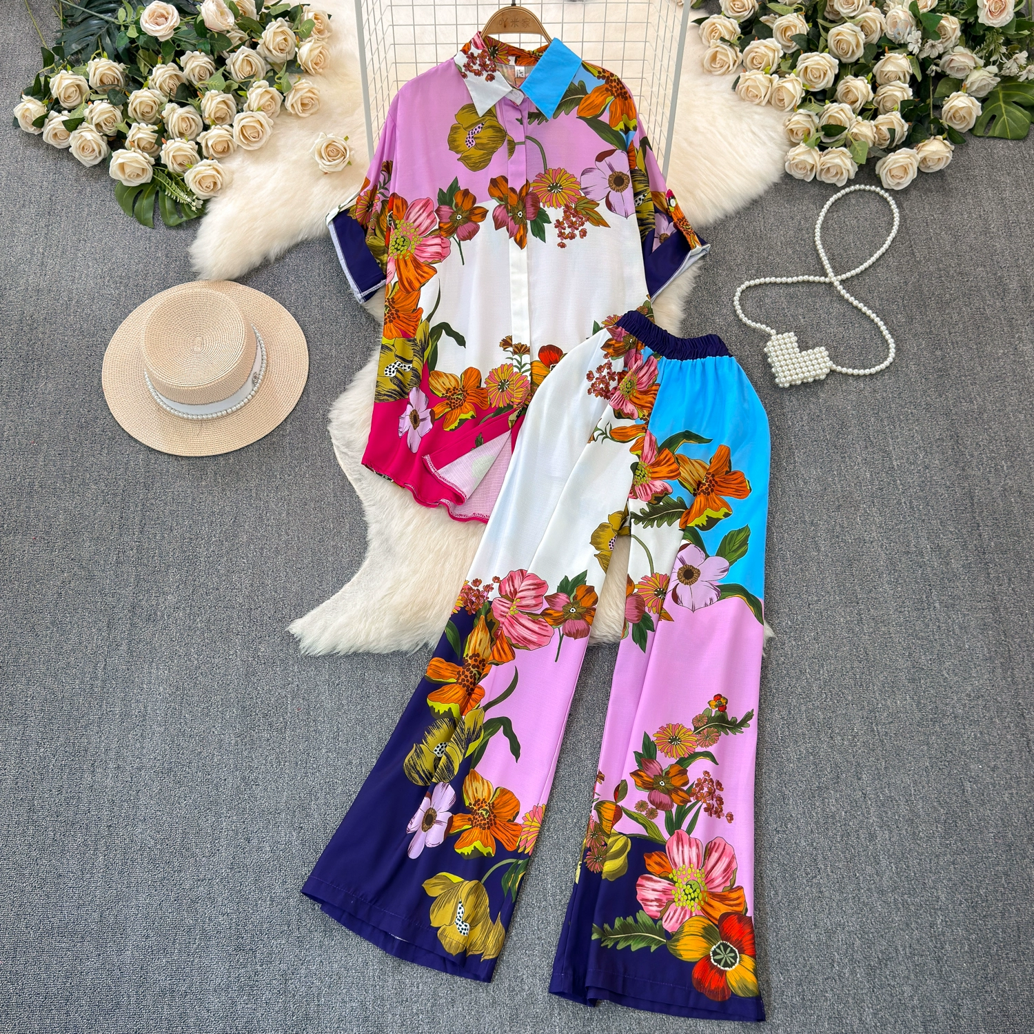 | nameOriginal | European and American light mature style high-waisted wide-leg trousers printed shirt |