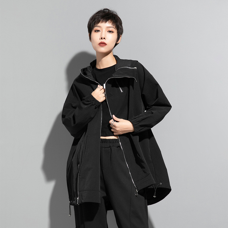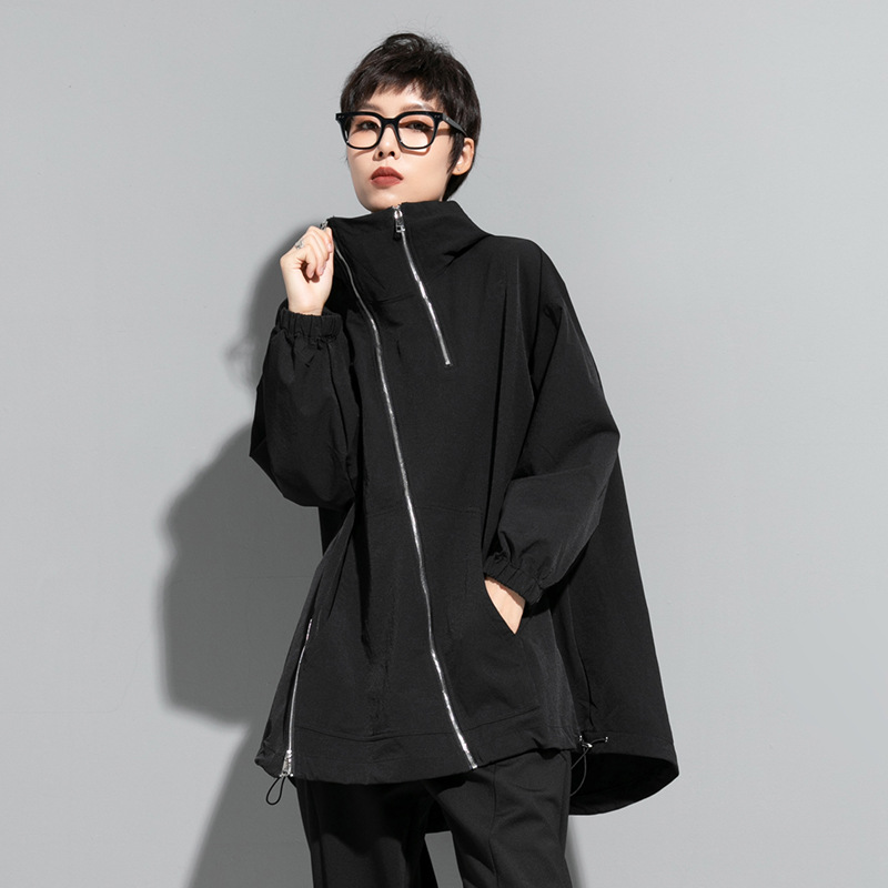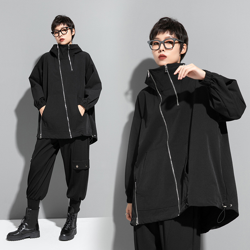 European and American Mid-Length Hooded Windbreaker for Chubby Girls Casual Plus Size Women’s Clothing with Oblique Zipper Niche Design Street Jacket National Fashion