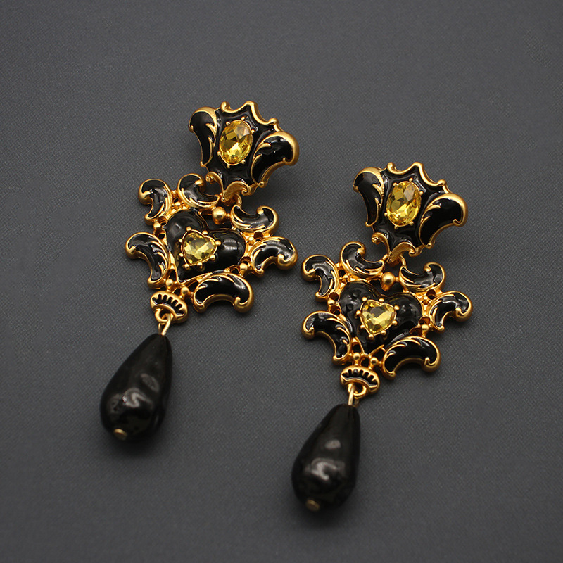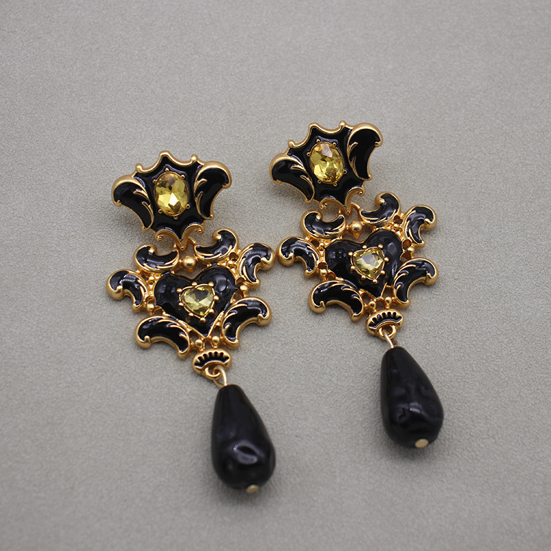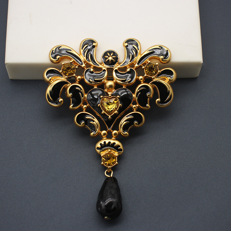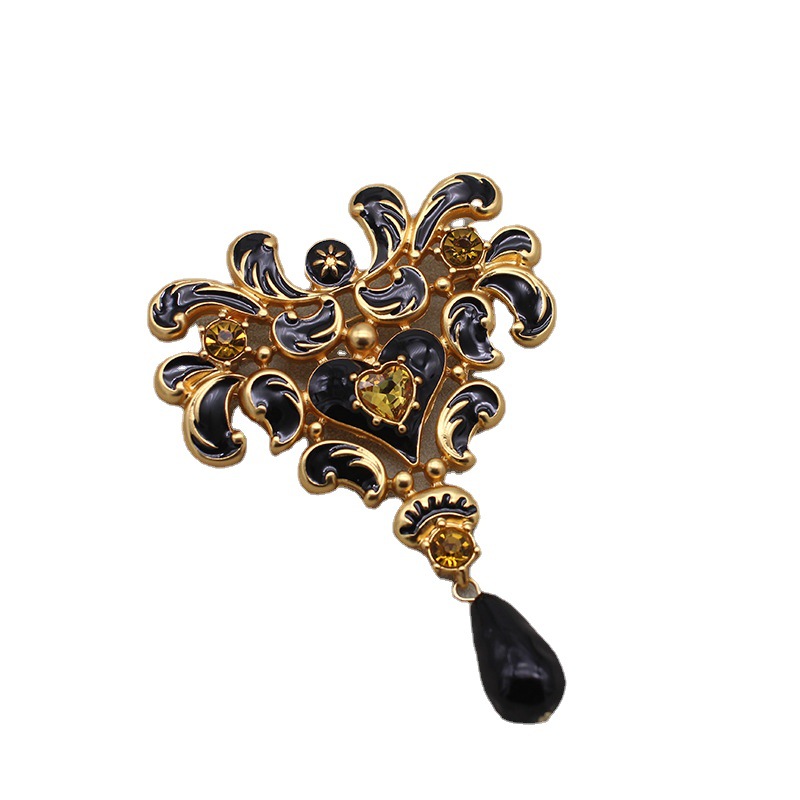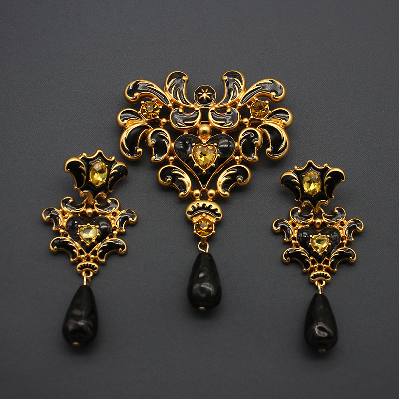 European and American Middle Ancient Brooch Earrings Set Laqua Black Gold Enamel Love Ear Stud Matching Chest Vintage