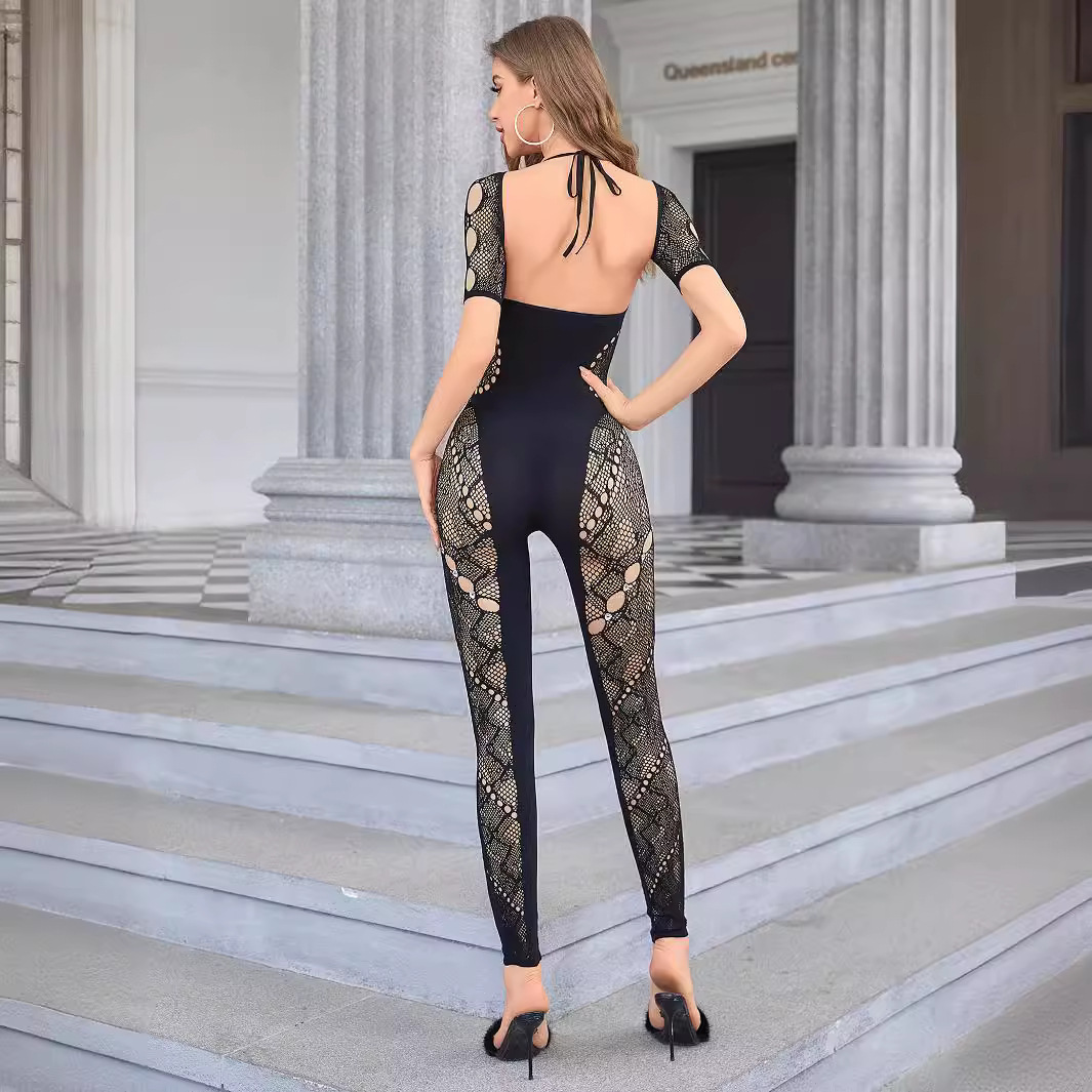European and American New 2024 Women’s Solid Color Short-sleeved Hollow-out Diamond-studded High Waist Slim-fit Sexy One-piece Knitted Jumpsuit