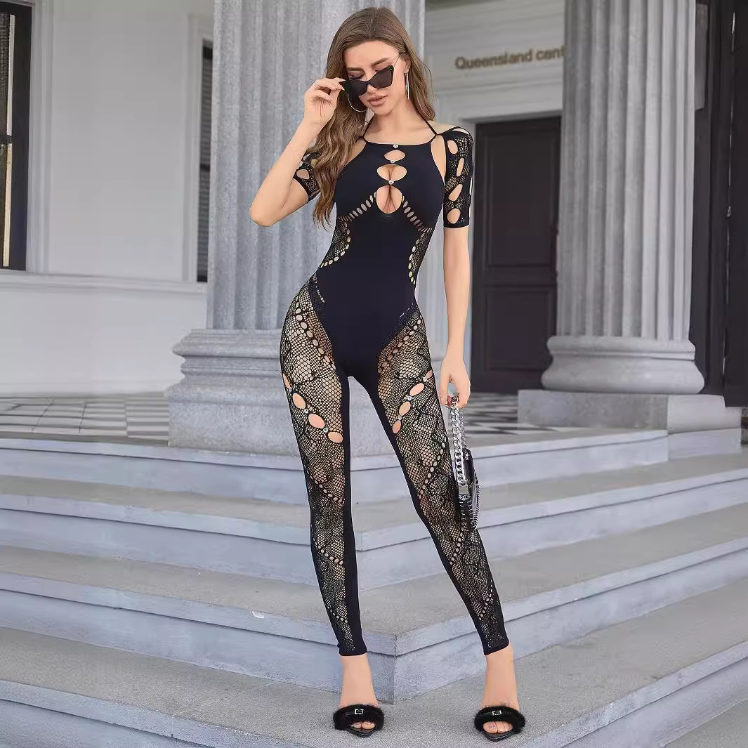 European and American New 2024 Women's Solid Color Short-sleeved Hollow-out Diamond-studded High Waist Slim-fit Sexy One-piece Knitted Jumpsuit
