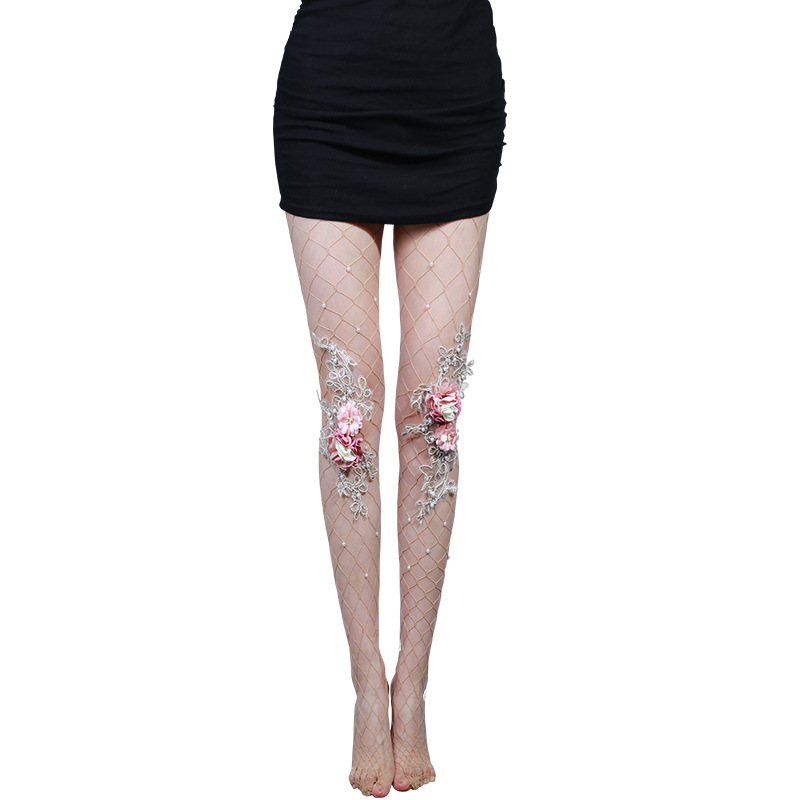| nameOriginal | European and American new hot rhinestone large mesh flower pearl skin color embroidery decoration large flower women's pantyhose large mesh stockings |