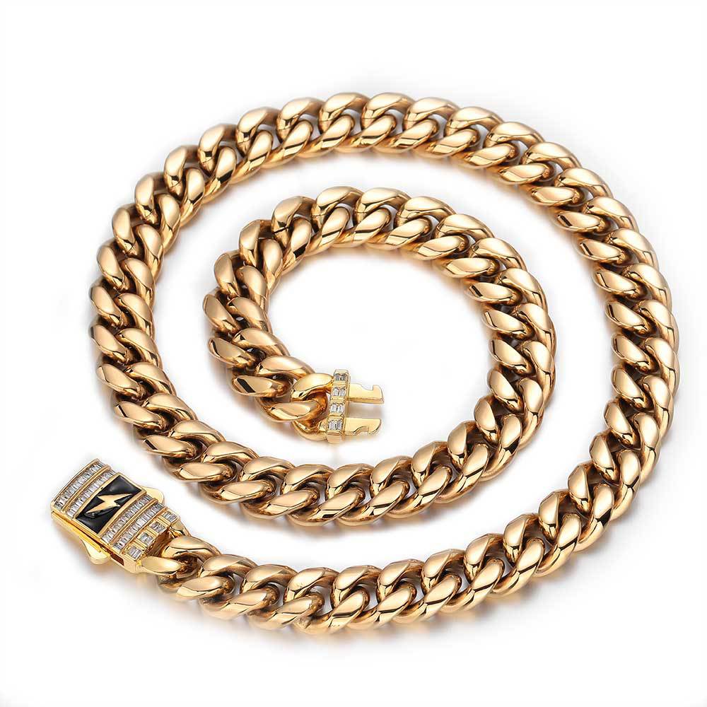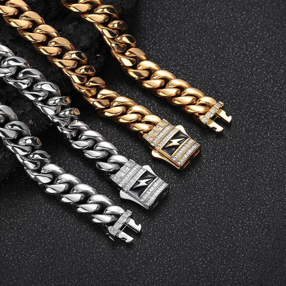 European and American new lightning zircon spring buckle stainless steel Cuban necklace cross-border hip hop titanium steel jewelry men's bracelet
