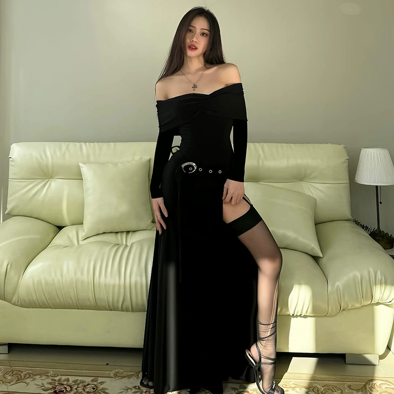 | nameOriginal | European and American sexy hotties one-shoulder black long dress 24 early spring ins pure lust style off-shoulder low-cut slit dress |