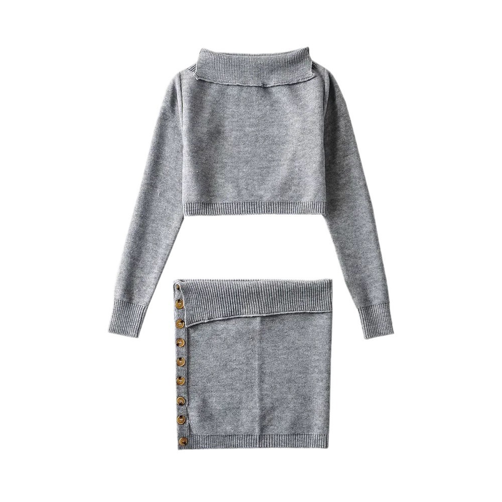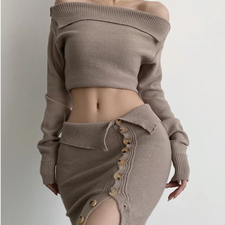 European and American sexy shoulder lapel sweater women's two-piece 2024 autumn and winter new high waist skirt sweater suit