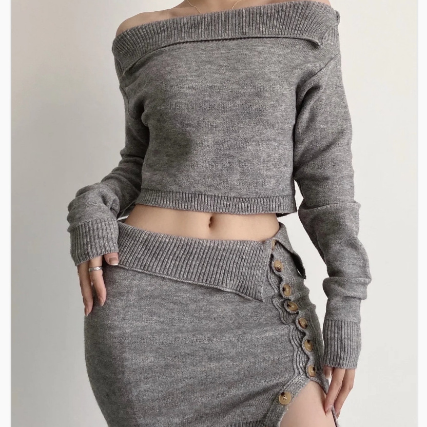 European and American sexy shoulder lapel sweater women’s two-piece 2024 autumn and winter new high waist skirt sweater suit