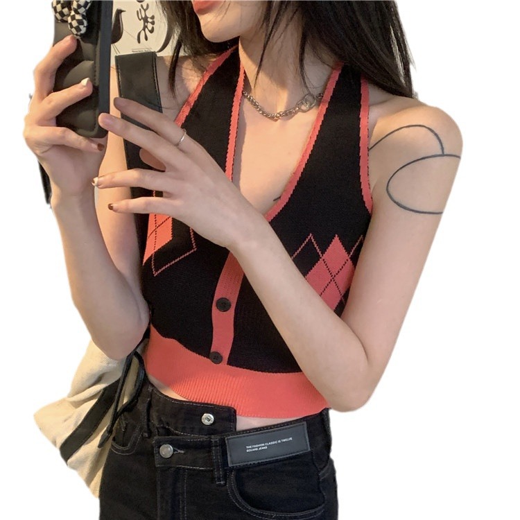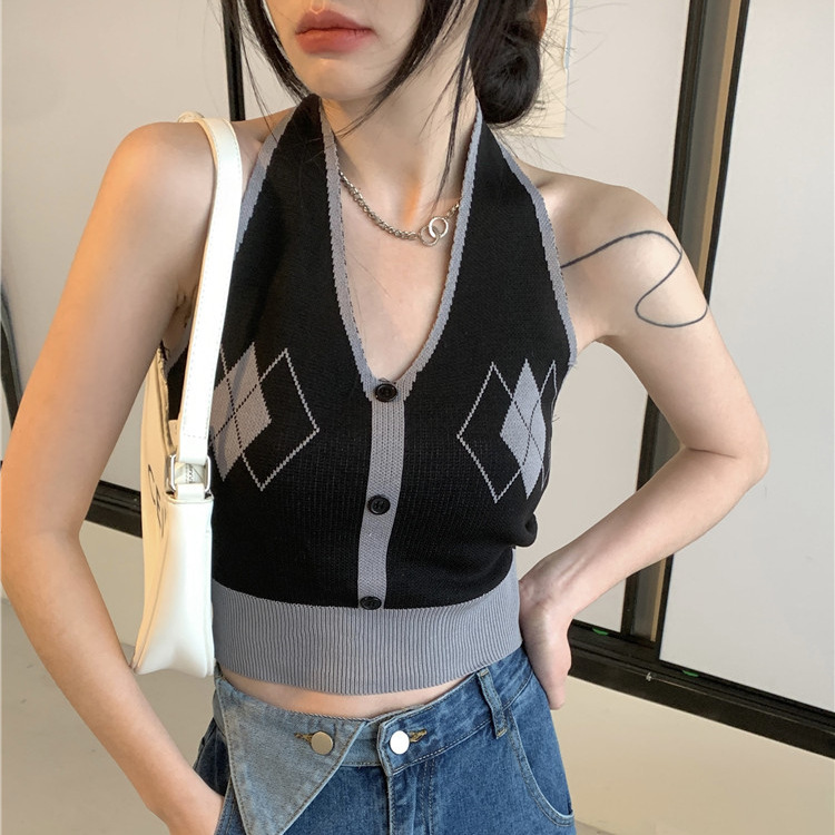 European and American Spice Girls British Style Diamond Plaid Slim-fit Slim-fit Vest Stitching Contrast Color Sleeveless Knitted Vest for Women