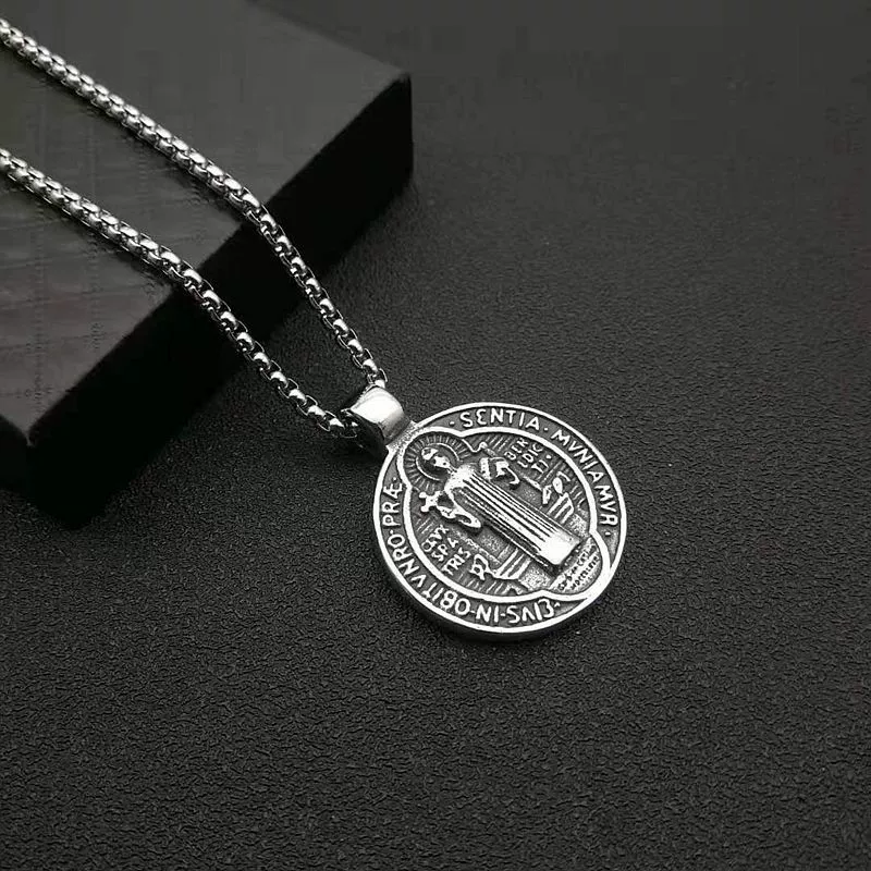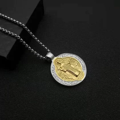 European and American St. Benedict’s exorcism card double-sided pendant necklace titanium steel cast gold-plated non-fading round card personalized pendant trend